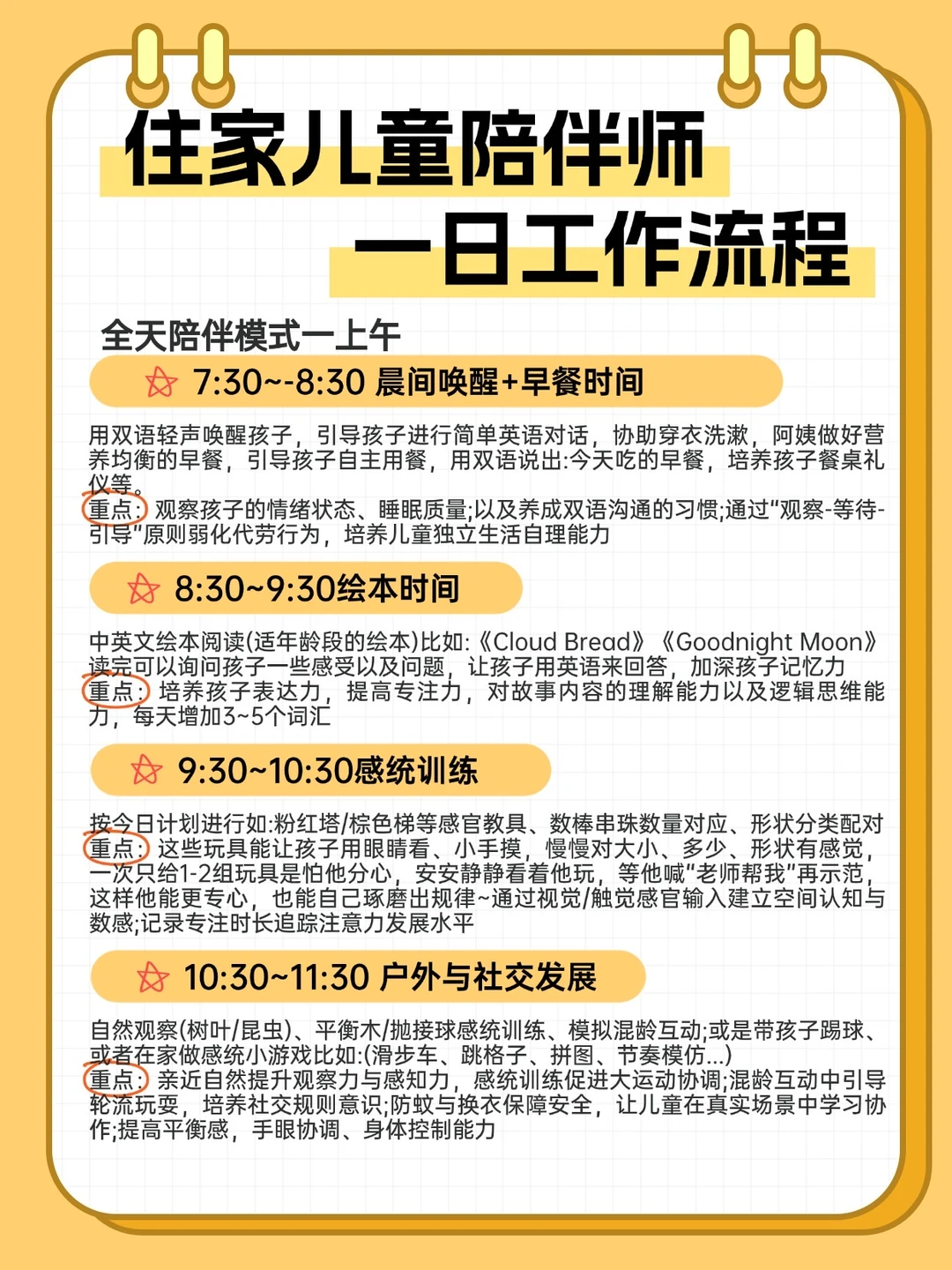 👉作为一名常年泡在高净值家庭圈的陪伴运营,今天就给大家扒一扒:专业的儿童陪伴师,在【孩子上学】和【全天陪伴】两种模式下,一天的工作流程差别有多大!👇