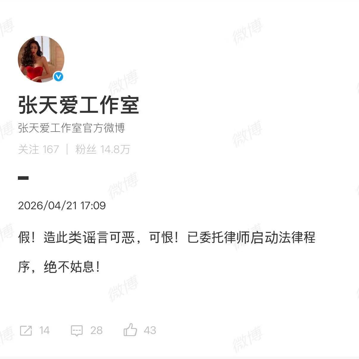 张天爱工作室发博回应张天爱工作室委托律师处理造谣,造女明星的谣真没底线,可恶至极
