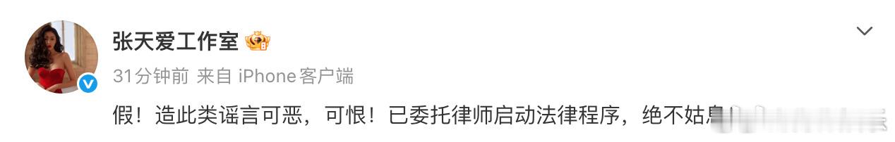 张天爱工作室 谣言可恶可恨近日,演员被传介入富商婚姻,对此,回应:“假!造此类谣言可恶,可恨!已委托律师启动法律程序,绝不姑息!”