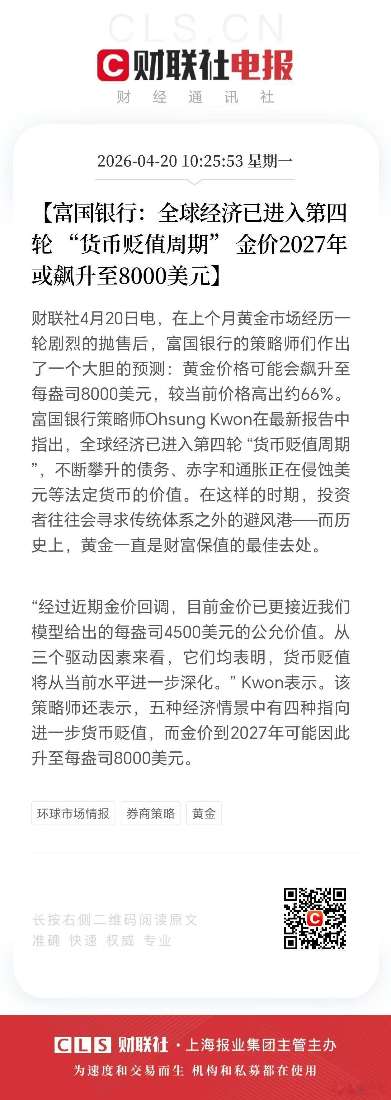 富国银行看高黄金至8000美元,核心逻辑直指全球货币贬值周期。央行已连续17个月