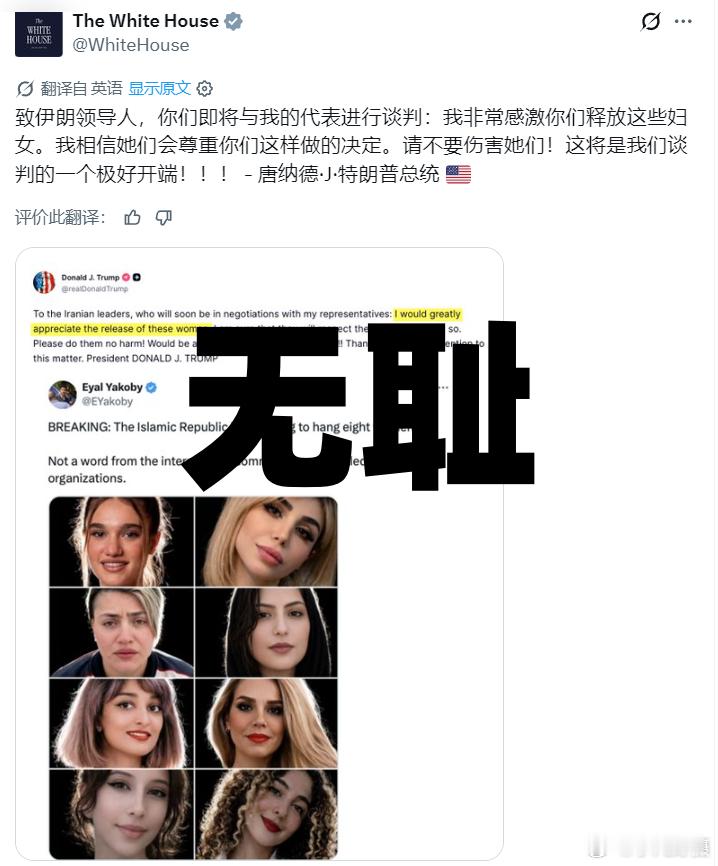 特朗普转发了一个以色列人的帖文称:“致伊朗领导人,你们即将与我的代表进行谈判:我非常感激你们释放这些妇女。我相信她们会尊重你们这样做的决定。请不要伤害她们!这将是我们谈判的一个极好开端!”