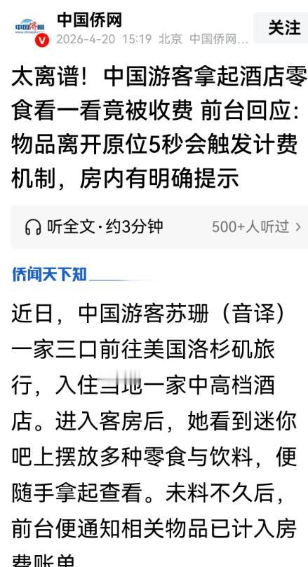 说白了,这就是一场离谱到没边的酒店“霸王收费”,住个中高档酒店,没吃没喝,就拿迷你吧的零食饮料看了两眼,居然就被强制收费,理由还荒唐到让人想笑——物品离开原位5秒就算消费,真真是把消费者当冤大头耍。