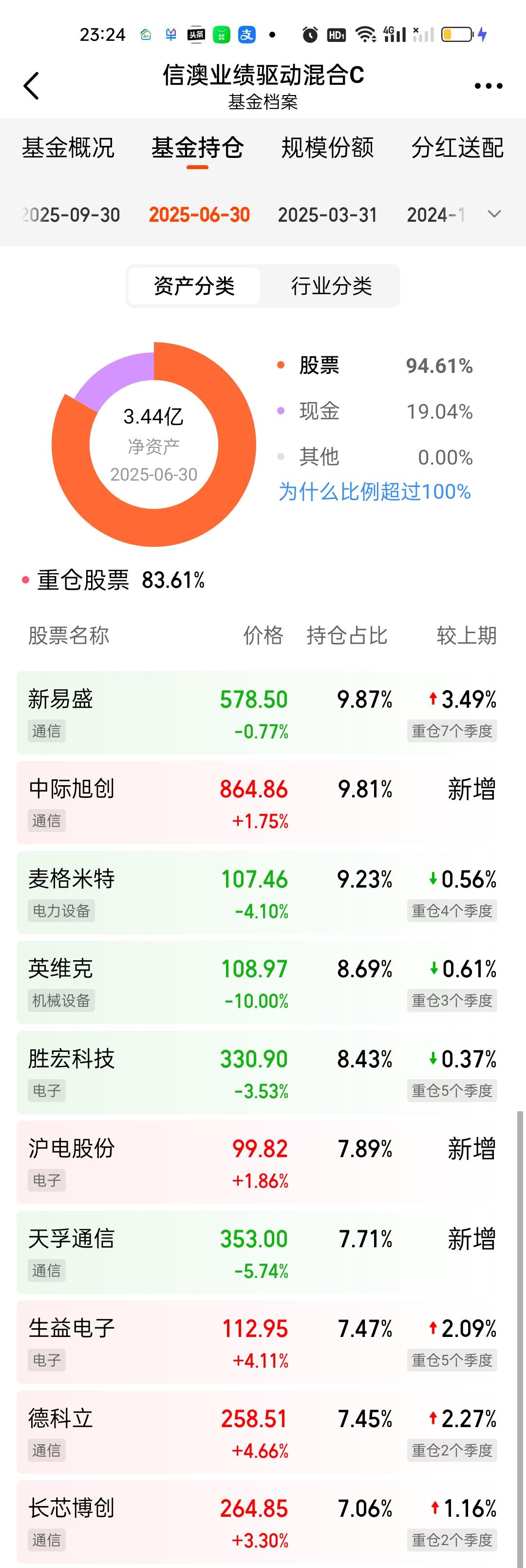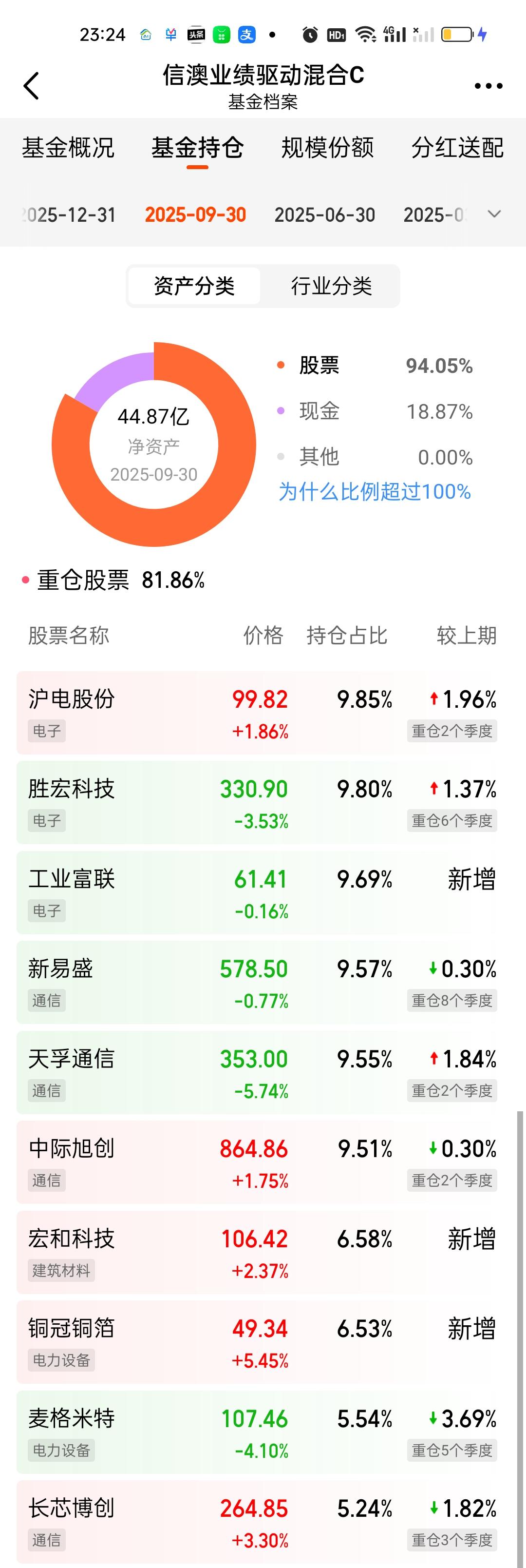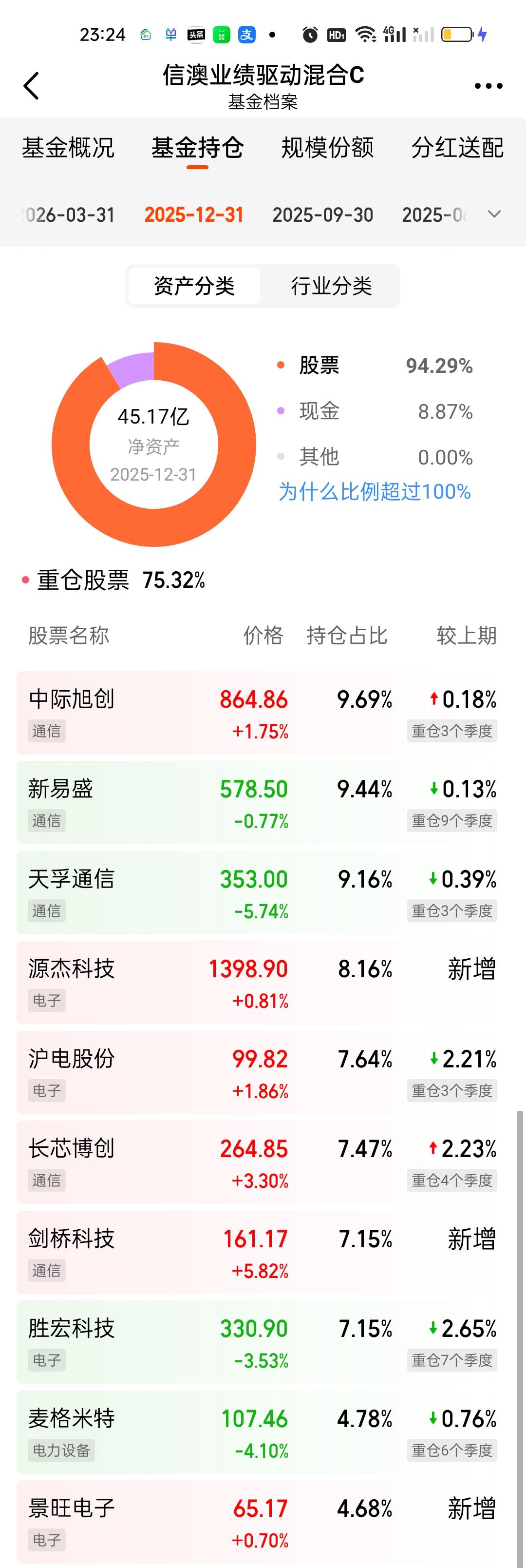 这次调仓换股新增了长飞光纤,永鼎股份,德科立和东山精密。舍弃了沪电股份,胜宏科技,剑桥科技,景旺电子,这是舍弃了PCB新增了光纤。收益也是大幅增加。但信澳业绩的规模降低了,持仓集中度也下降了,明显防御的味道更明显了。
