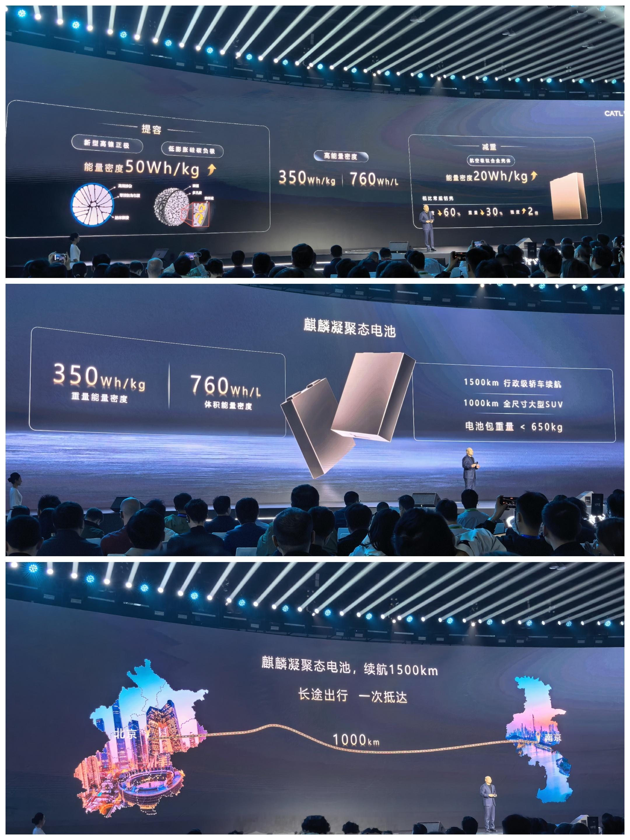 什么叫掀桌子,宁德时代就是在掀桌子。今天最重磅的消息无疑是麒麟凝聚态电池,宁德时代首次将航空级凝聚态技术应用于乘用车领域的动力电池产品,创下量产电池最高纪录。该技术此前面向载人航空电动化研发,并且已经在4吨级商用飞机完成首飞验证,即将在8吨以上商用飞机展开进一步验证。它比普通的磷酸铁锂电池能量密度提升了75%“一块马上要顶两块了”,电芯的能量密度是350Wh/kg,体积能量密度是760Wh/L。高能量密度的优势,举个最简单的例子,都知道新能源车非常重视整车 重量的控制,同样100度的电芯,麒麟凝聚态电芯只有285.7kg,而同样的100度如果换成磷酸铁锂就要500kg,重了近1倍。采用了麒麟凝聚态电池以后续航,5米长的纯电轿车续航可以到多少?1500㎞!全尺寸的大型SUV纯电续航也将来到1000㎞。这还是在将电池包重量控制在650kg以内。他也是支持4C超快充,15分钟即可完成10%-80%充电。就是燃油车,你想跑1500公里,加油得加多久?那有的的人问,光续航安全性怎么样?凝聚态可以在电芯层级精准实现锯断不起火,并且依然可以正常放电,真正意义上做到了安全可控。今天发布会最后曾博士有句话我非常认同“科学不是漂亮话,而可验证的可复制的,脱离客观规律的去谈颠覆,是对代价的不负责。”技术不光要听的人觉得厉害,更要让用的人时刻安心,这就是为什么我常说“选电车看电池认准宁德时代”,确实厉害没得说。宁德时代