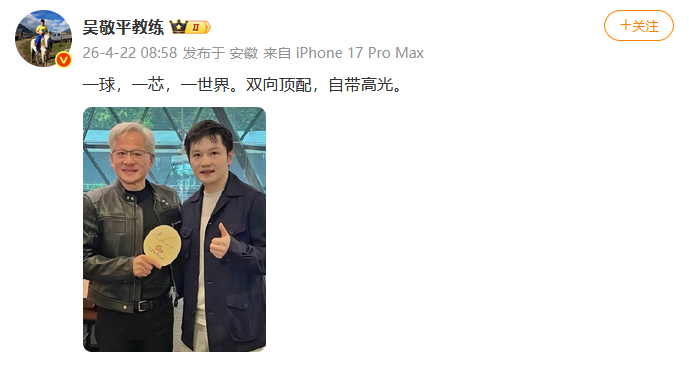 樊振东恩师@吴敬平教练22日转发了相关照片,配文称“一球,一芯,一世界。双向顶配,自带高光”。
