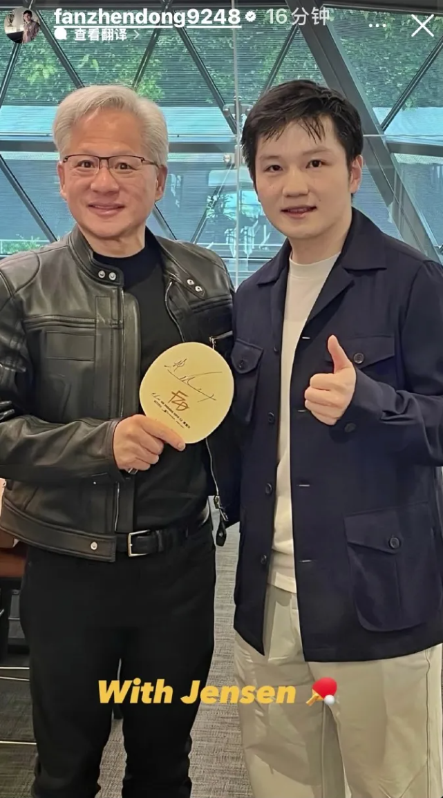 4月21日,樊振东更新社媒,分享和英伟达创始人黄仁勋的合影,并在美国加州谷歌总部与霸王龙化石自拍。