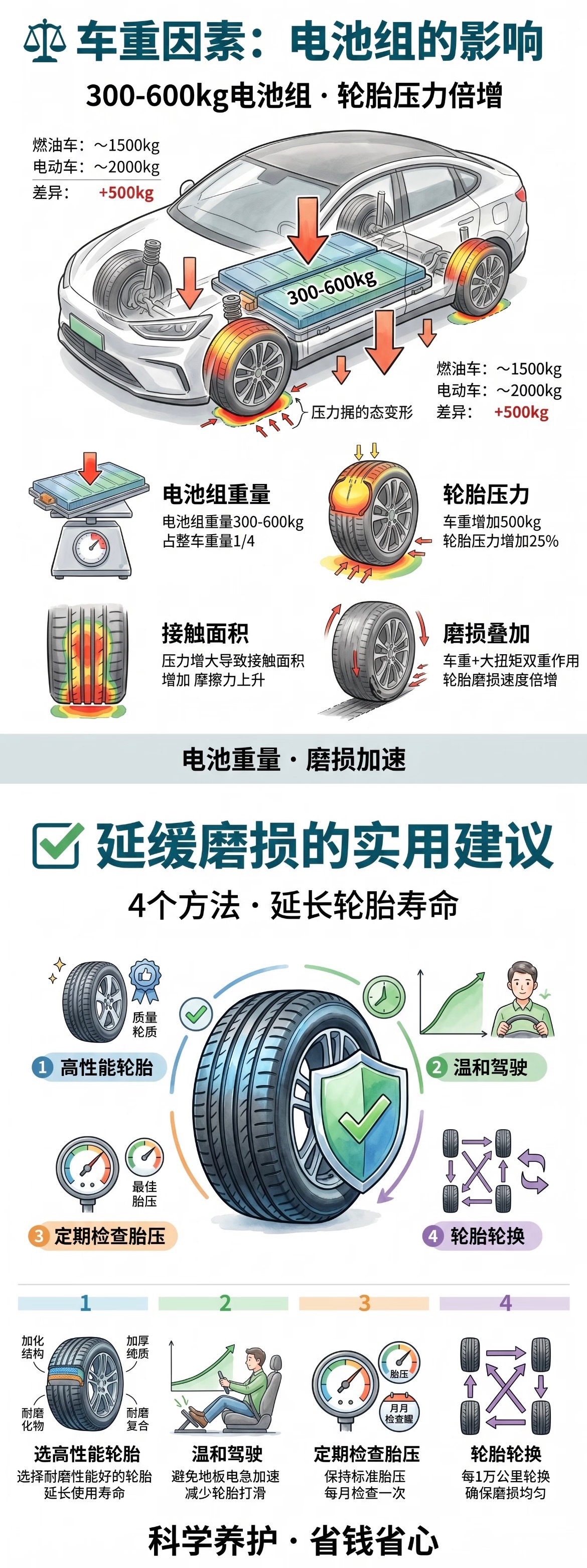 那怎么延缓磨损?我的建议很简单,开车尽量线性一点,少暴力加速;胎压保持在厂家建议的偏高区间(一般2.6-2.9bar);一万公里左右做一次前后轮对调;换胎时优先考虑EV专用胎。