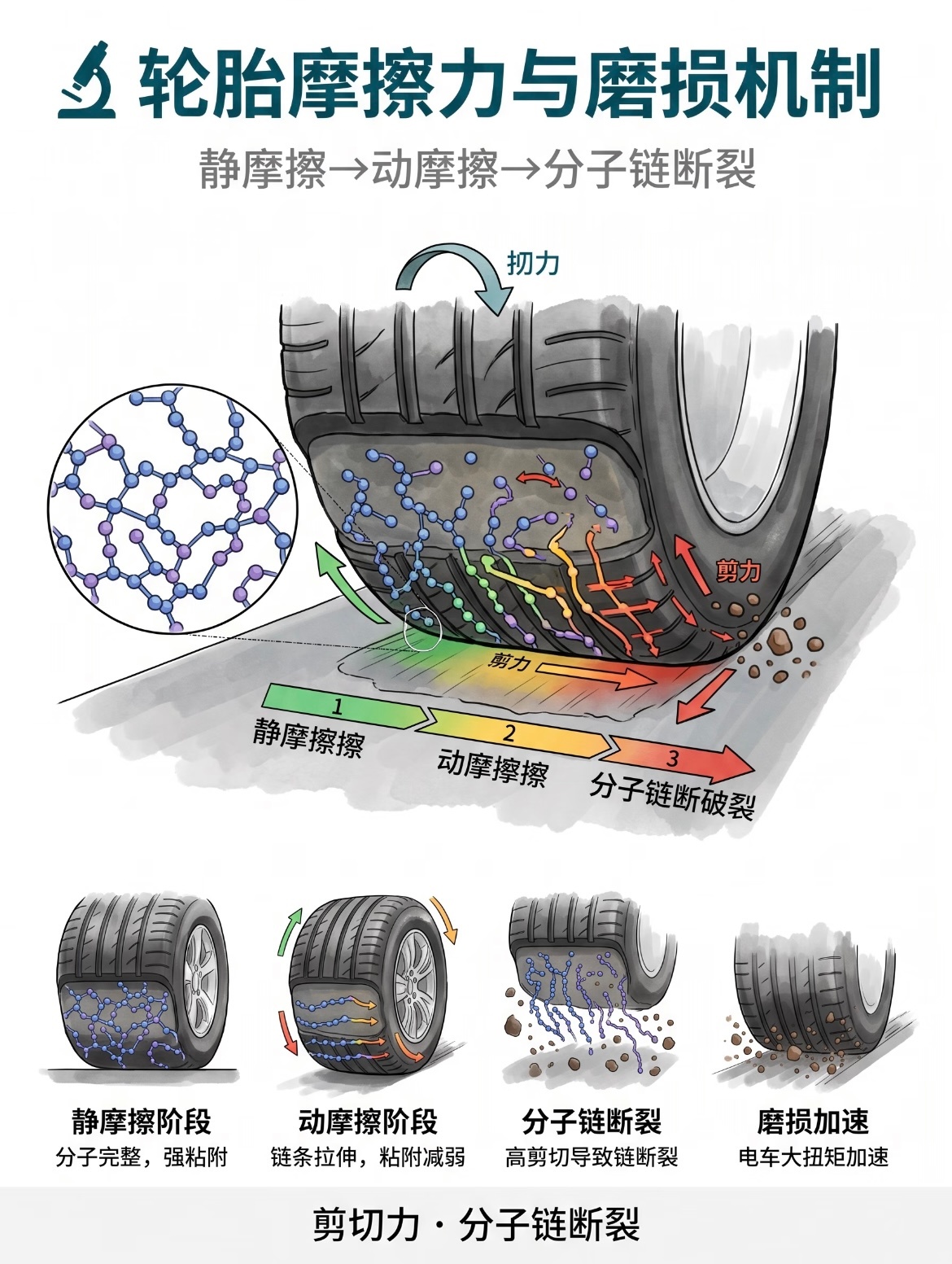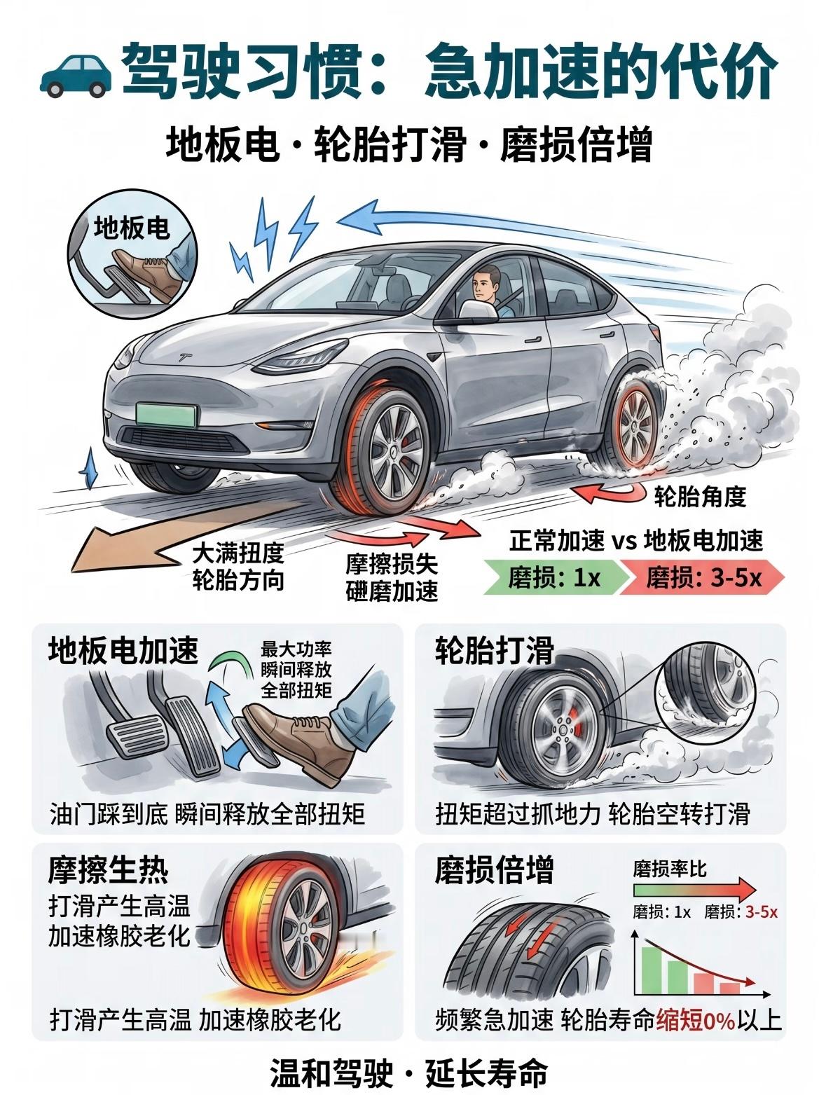 第二是扭矩输出。电机的特点就是“起步即巅峰”,一脚电门下去,扭矩瞬间释放,轮胎和地面会产生轻微打滑。虽然体感很爽,但对橡胶来说,就像被反复打磨。