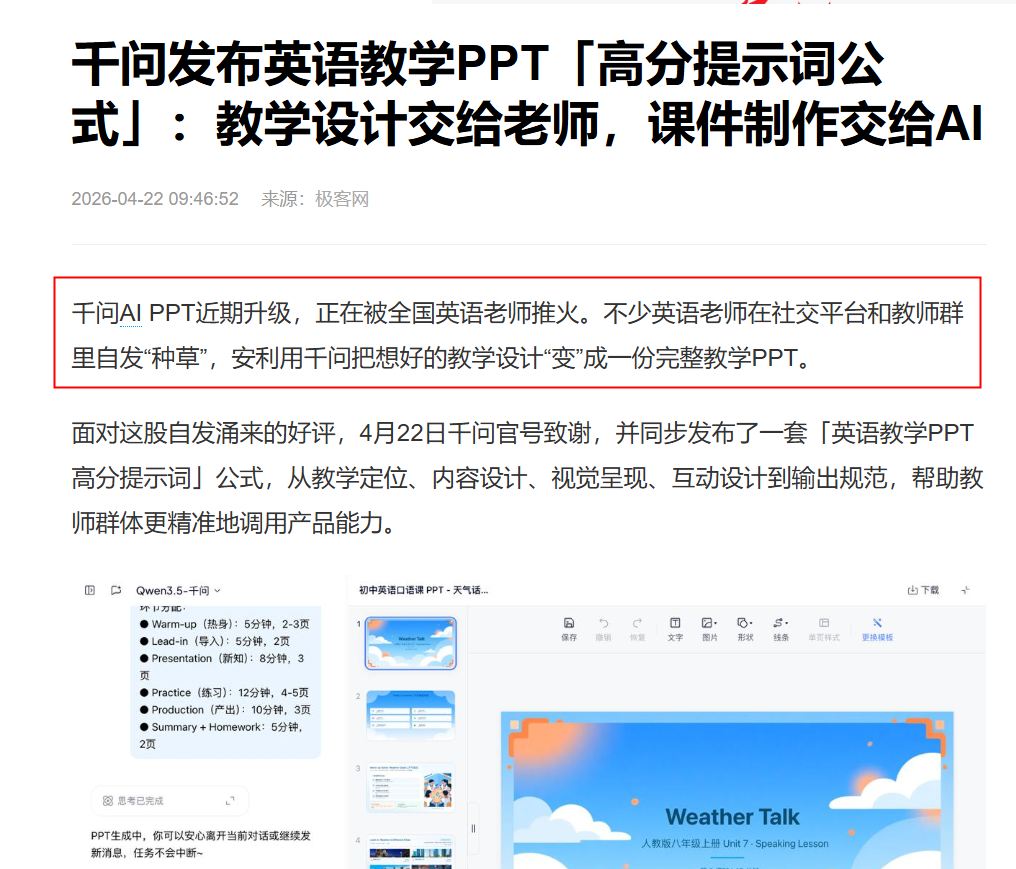 第二个变化,国内老师用千问生成PPT课件,把千问用到排队了。近期,千问PPT Agent向所有用户免费开放。