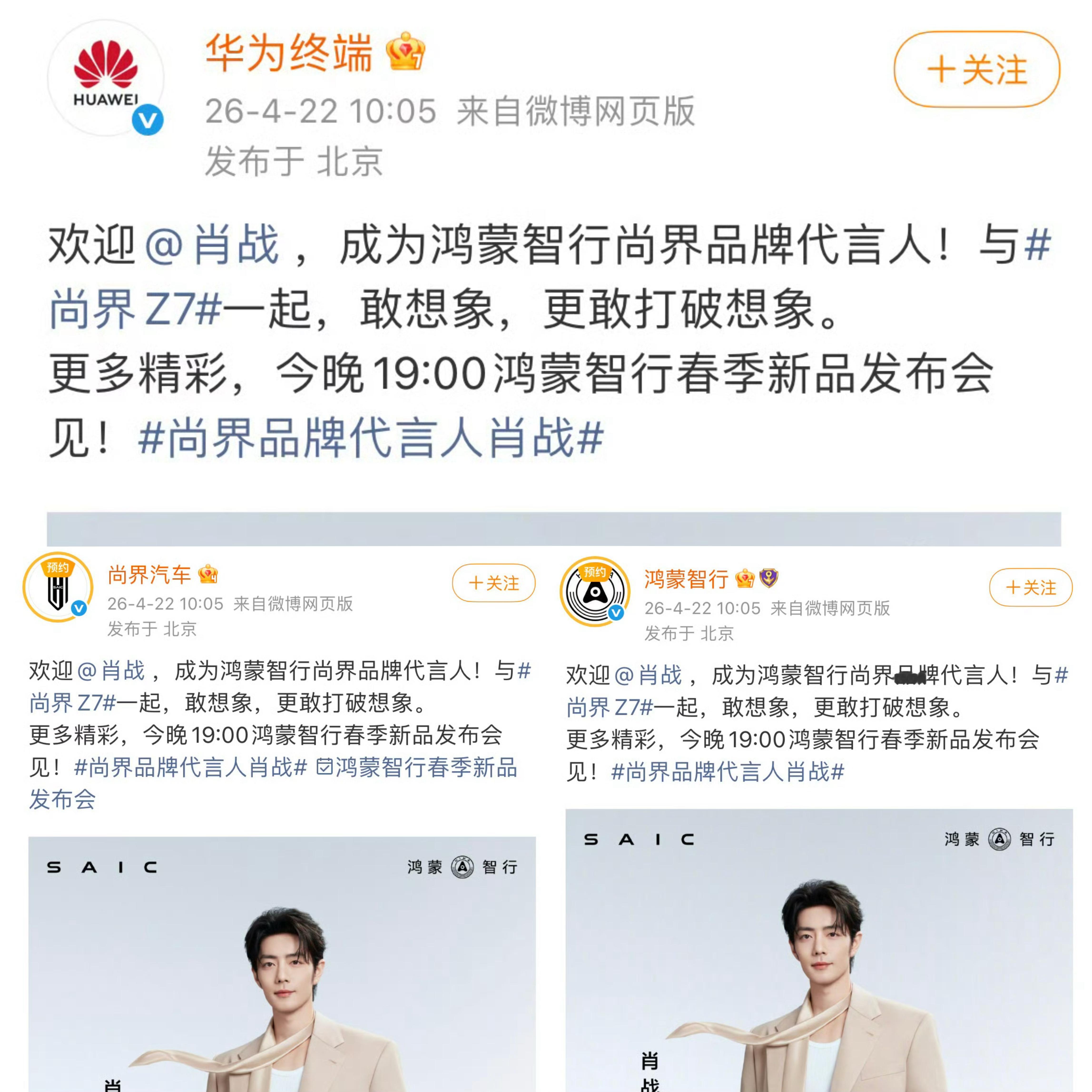 尚界品牌代言人肖战余承东亲自官宣!鸿蒙智行尚界首位也是唯一空降品牌代言人肖战☝️