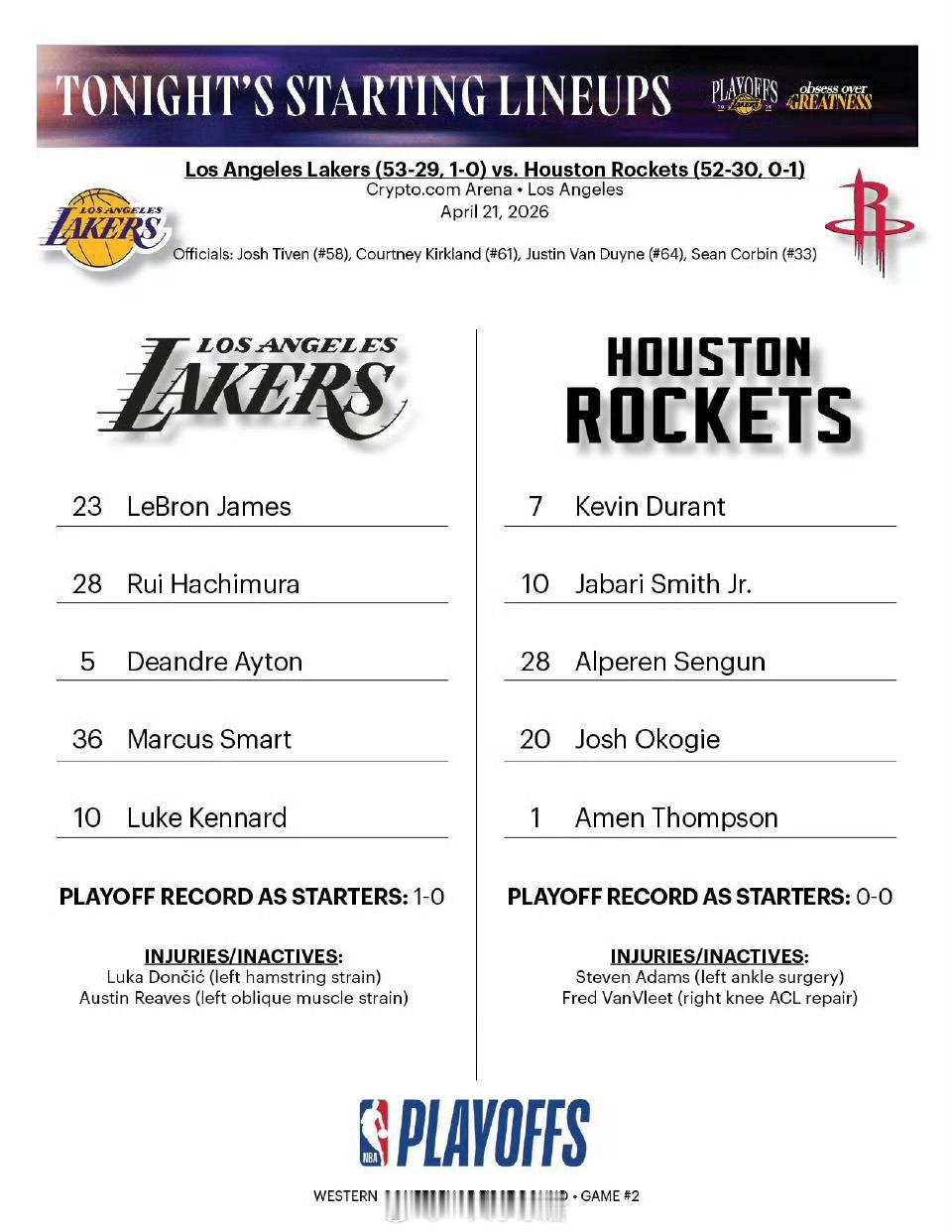 双方首发阵容,杜兰特回归!火箭vs湖人
