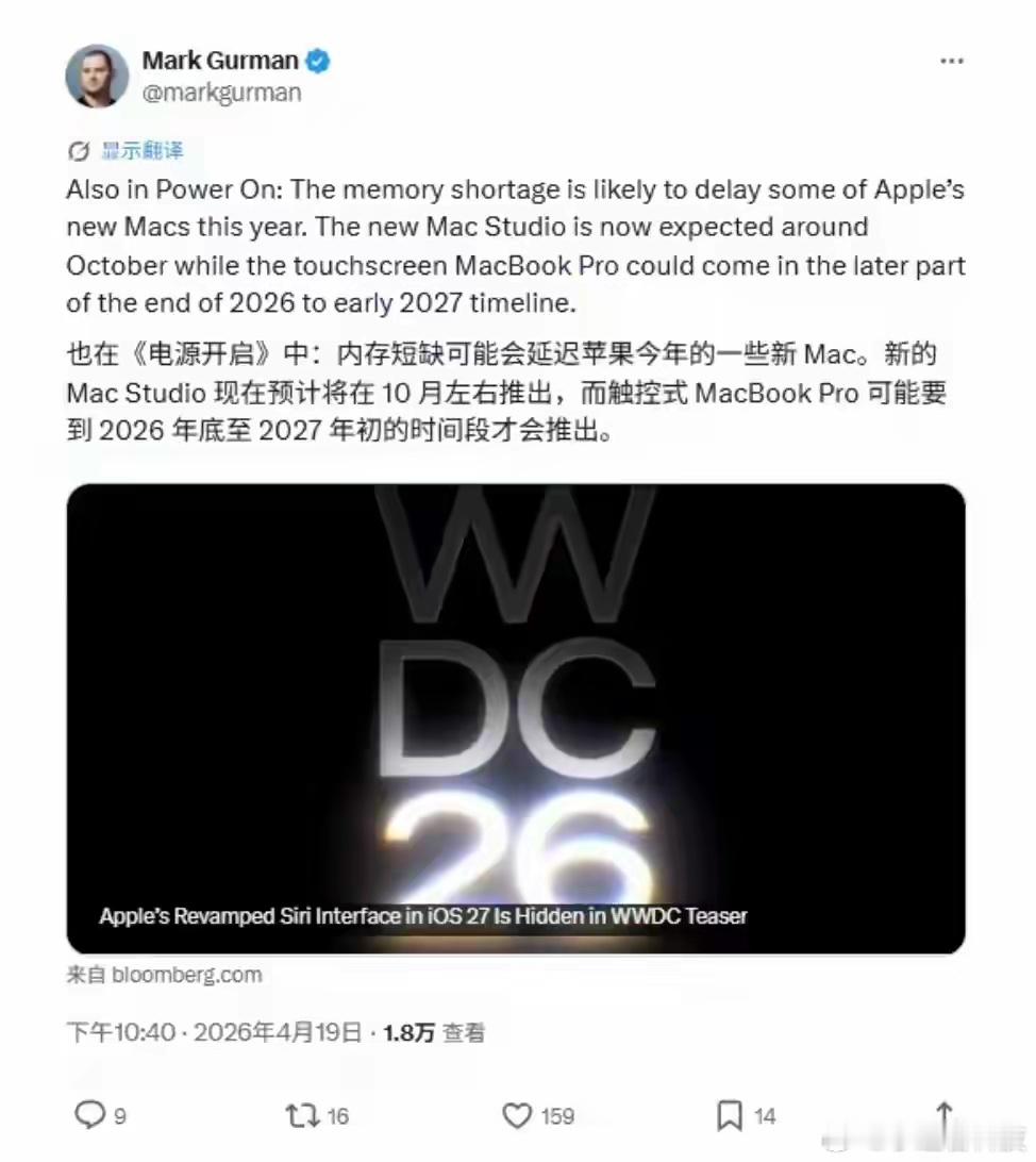 两款Mac新品或推迟刚看到苹果两款Mac新品延期的消息,原因是内存短缺。说真的,现在行业里高端内存/存储的供应链波动真的太影响节奏了。本来以为WWDC能看到新Mac Studio和触控屏MacBook Pro,现在一个推到10月,一个直接拖到2026年底到2027年初…这种核心零部件缺货,比产品开发延期还让人头疼啊。