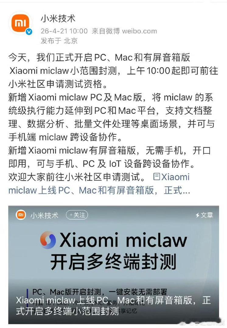 小米发布PC和Mac版龙虾小米龙虾完成关键一步升级,从移动端延伸至PC、Mac全桌面平台,正式实现人车家全生态AI闭环。跨设备协同、桌面办公处理、离线语音全能力拉满,还全面兼容苹果生态设备,MiMo大模型稳居行业第一梯队,短短一个月完成全终端覆盖国产AI全球化、跨生态布局,小米这次是真的走在最前面了!
