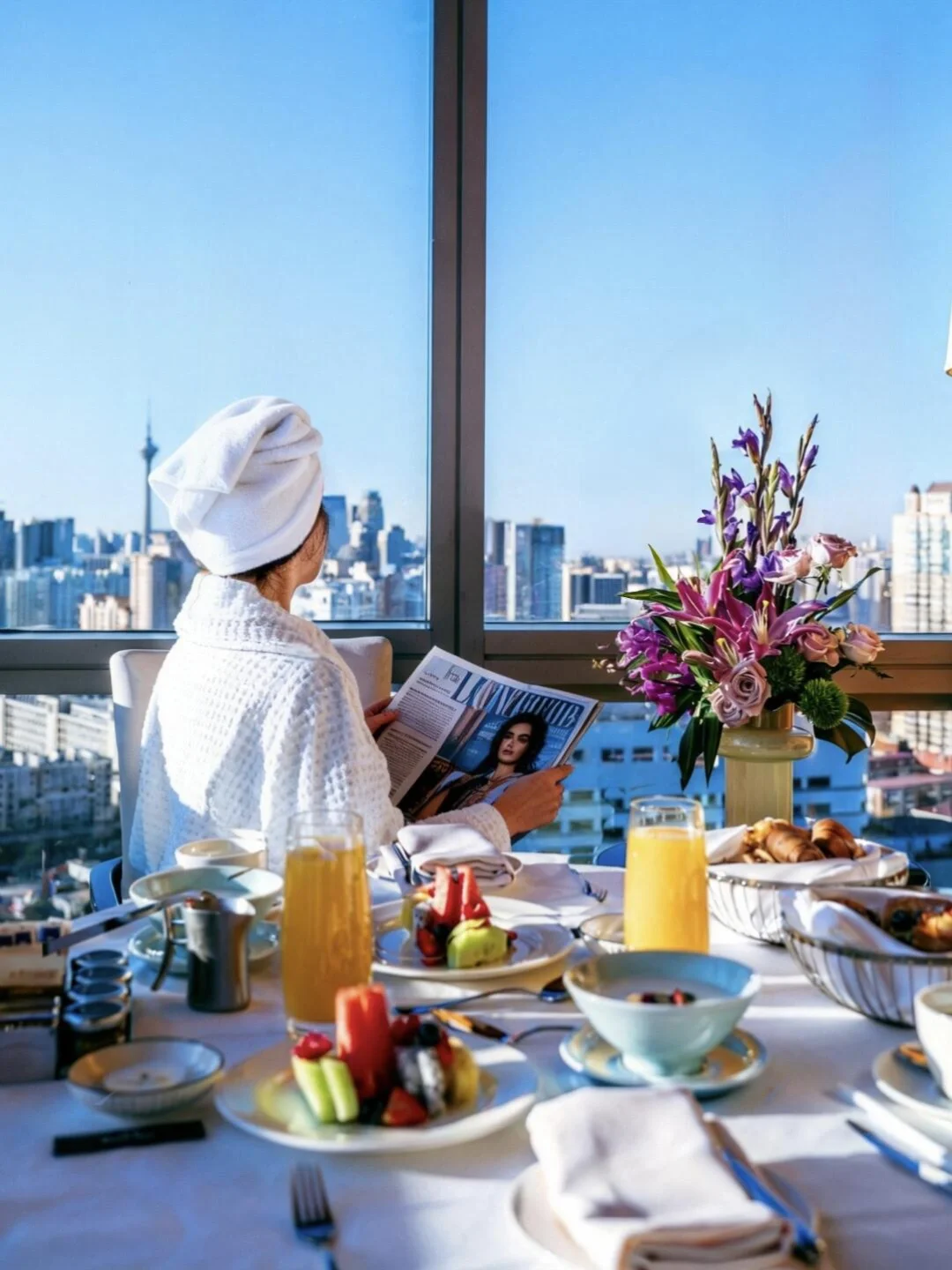 在窗边用早餐,