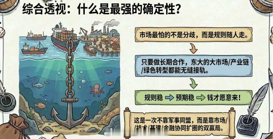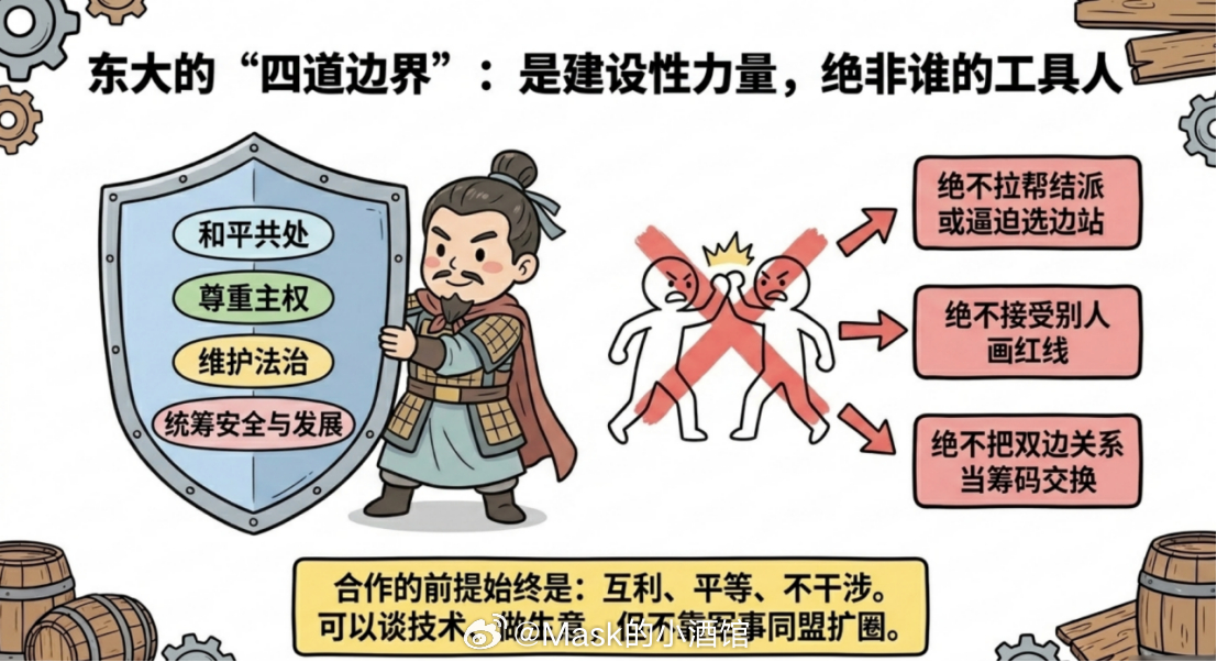 东大不会给任何人背书,合作的前提始终是:互利、平等、不干涉。你可以来东大做生意、谈投资、谈技术、谈航运,但不能指望东大变成谁的工具人。从财经角度说,这反而是最强的确定性。因为市场最怕的不是分歧,而是规则随人走。东大现在给海湾国家释放的信号是:只要你愿意做长期合作,东大的大市场、完整产业链、绿色转型能力、数字经济能力,都可以接上;但如果你想让东大替别人打配合,那不好意思,这条路走不通。规则稳,预期才稳,预期稳,钱才愿意来。