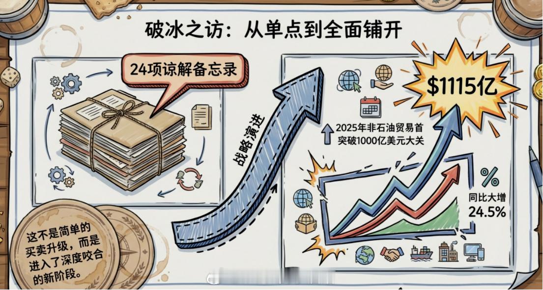 双方讲的已经不是单一的油气买卖,而是贸易、投资、科技、农业、中医药、创新合作一起铺开。说白了合作菜单已经从传统能源套餐,升级成了综合大礼包。再看金额和趋势,就更有意思了。阿联酋外贸部长公开说,2025年中阿非石油贸易首次突破1000亿美元,达到1115亿美元,同比大增24.5%。