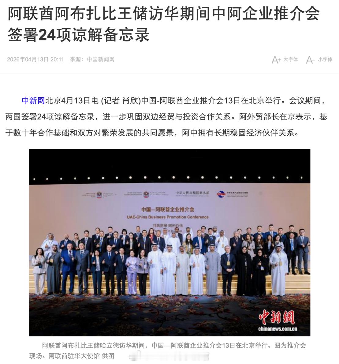 这次阿联酋来访,表面看是经贸升级,往深一层看,是阿联酋在中东局势动荡、美国安全承诺边际走弱、全球金融和能源链条更不稳定的背景下,明显把东大放到了更关键的位置上。首先,这次中阿在北京签了24项谅解备忘录,阿联酋官方和多家媒体都确认了这一点: