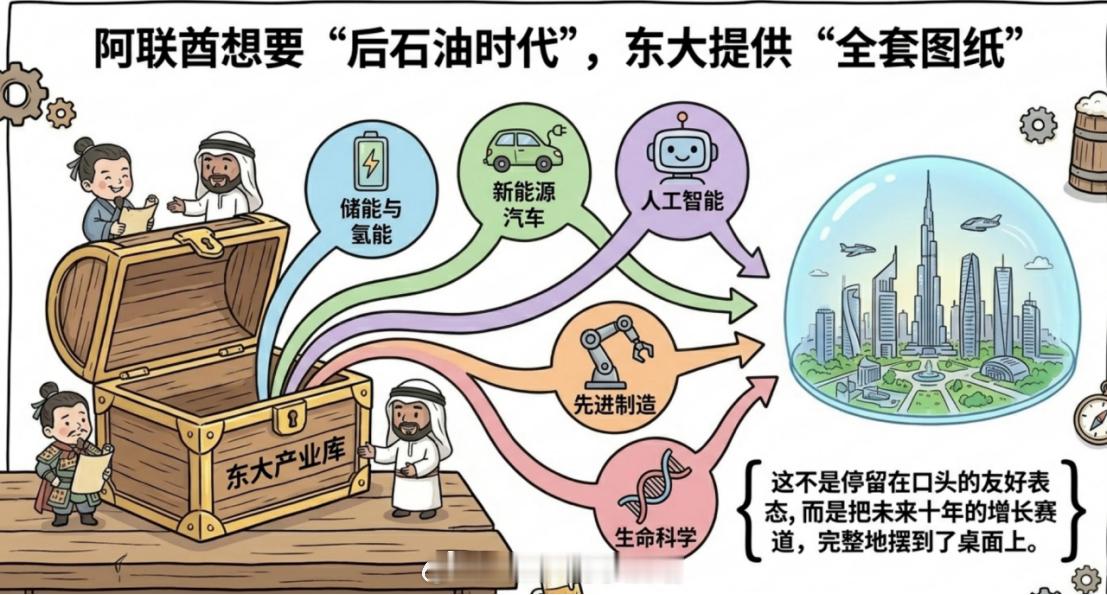 阿联酋很清楚,美国已经渐渐靠不住了。美国当然还是重要力量,但当地区风险、航运风险、金融风险一起冒头时,阿联酋必须把东大这个全球最大制造中心、重要能源买家、稳定投资来源和国际斡旋力量,更深地拉进自己的国家战略框架里!这一点,从咱们的公开表态也能看出来,我们这次合作的方向非常具体:储能、氢能、新能源汽车、动力电池,还欢迎阿方扩大在人工智能、数字经济、先进制造、生命科学等领域对华投资,同时还提到互联互通和金融合作。注意,这不是停留在友好表态,而是把未来十年的增长赛道都摆到桌上了。阿联酋想要后石油时代,东大给的是一整套产业化选项。
