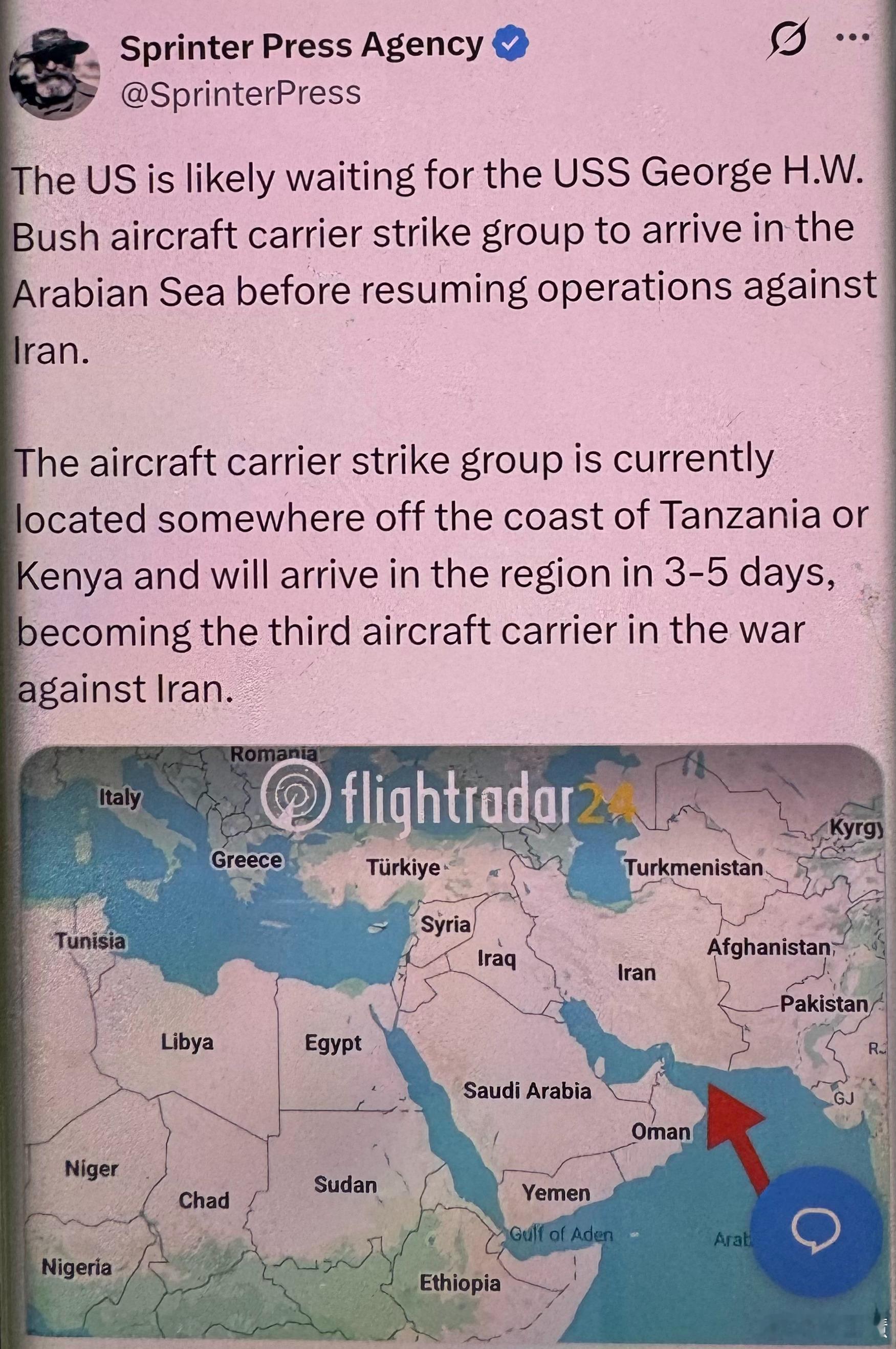 3-5天到位!美军第三航母逼近伊朗,中东大战一触即发?美国或正等待“乔治·H·W·布什”号航母打击群抵达阿拉伯海,再恢复对伊朗的军事行动。该航母打击群目前位于坦桑尼亚或肯尼亚外海海域,将在3-5天内抵达该区域,成为美军对伊朗战事中的第三艘航母。受困霍尔木兹船员2万果蔬补给吃20天