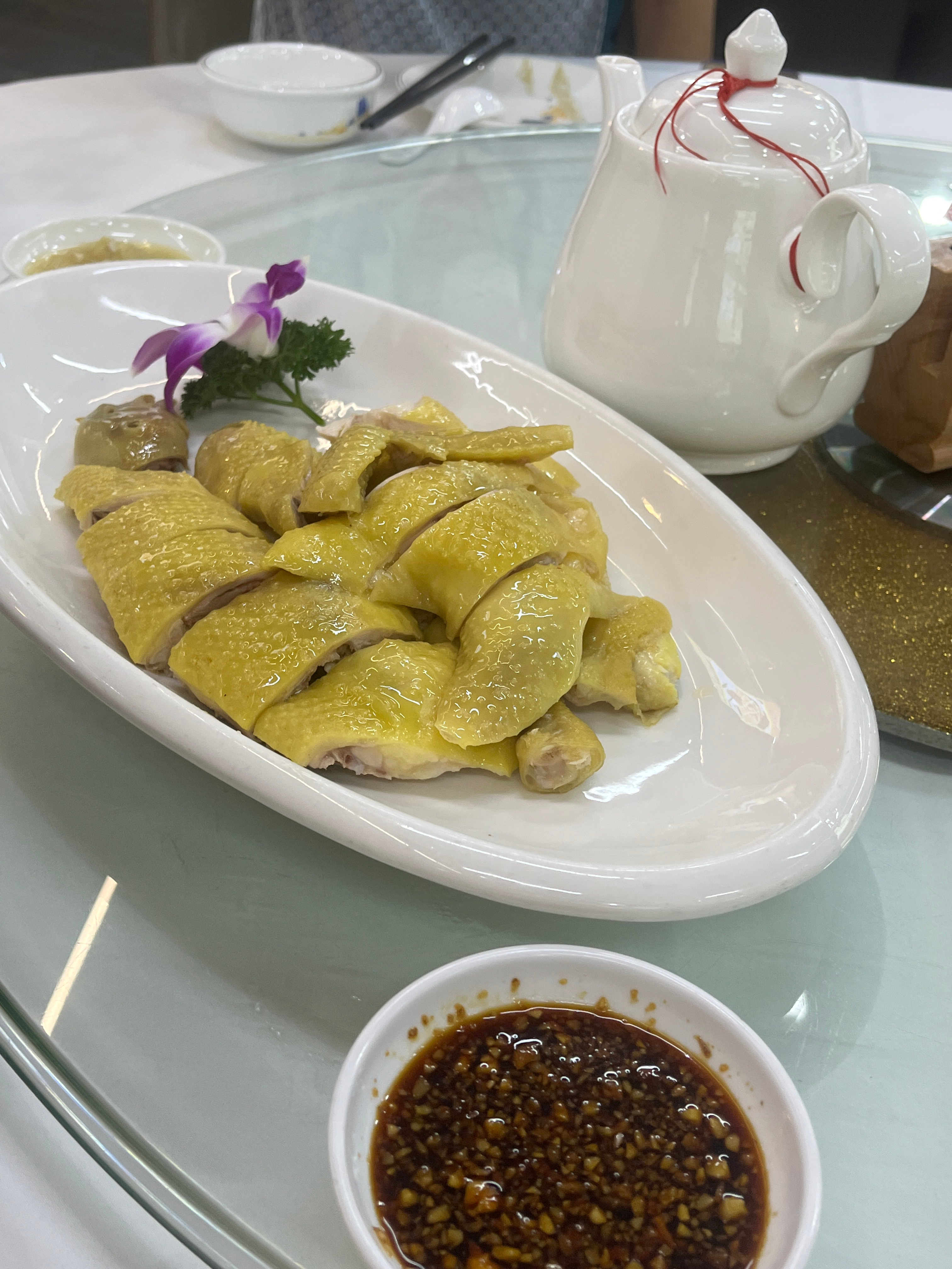 白切鸡🐔鸡肉还不错,肉质很嫩,吃了一块鸡腿肉,绝了!蘸姜葱比酱油的好吃