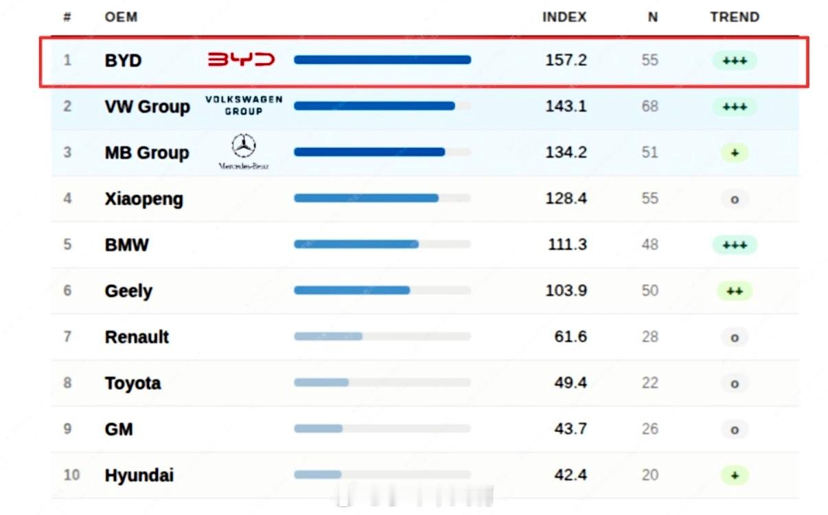 榜单数据显示,大众以143分排名第二,梅赛德斯-奔驰以134分位列第三,小鹏汽车、宝马、吉利集团依次排在后续位置,榜单前十名中,中国品牌共占据三席。