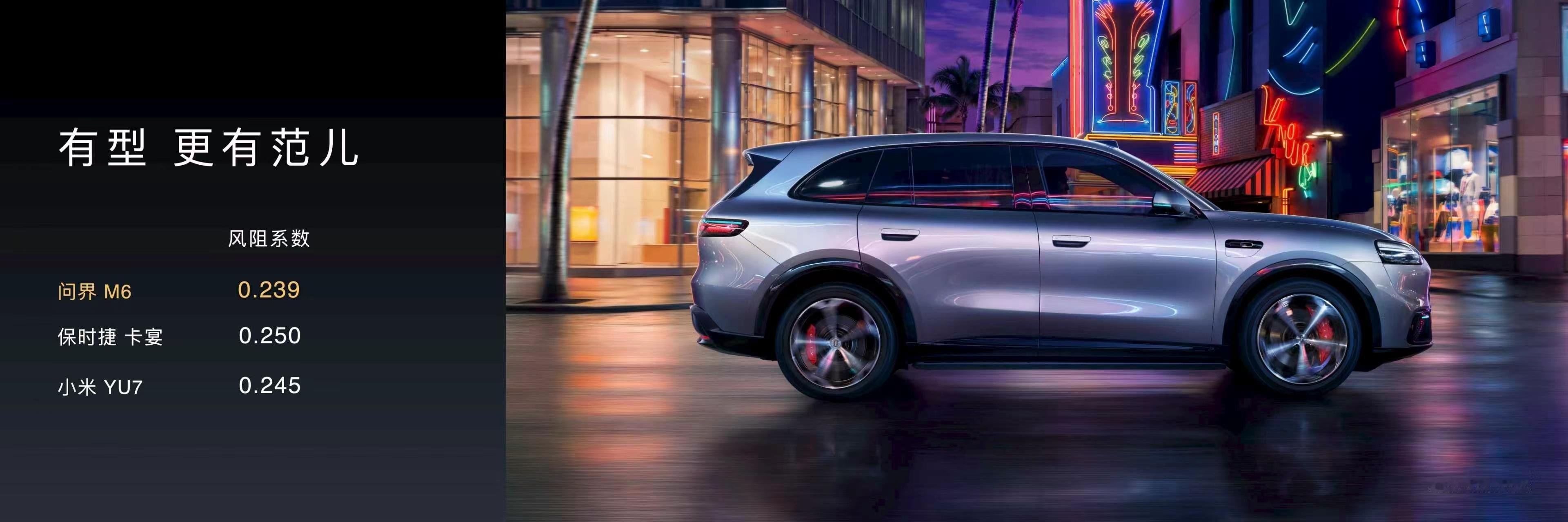 整车采用高效空气动力学设计,通过密封性加强、双层导风通道、低趴车头、空气动力学轮毂等优化,风阻系数低至0.239cd,整车看着有型也有范儿。问界M6动态评测首发