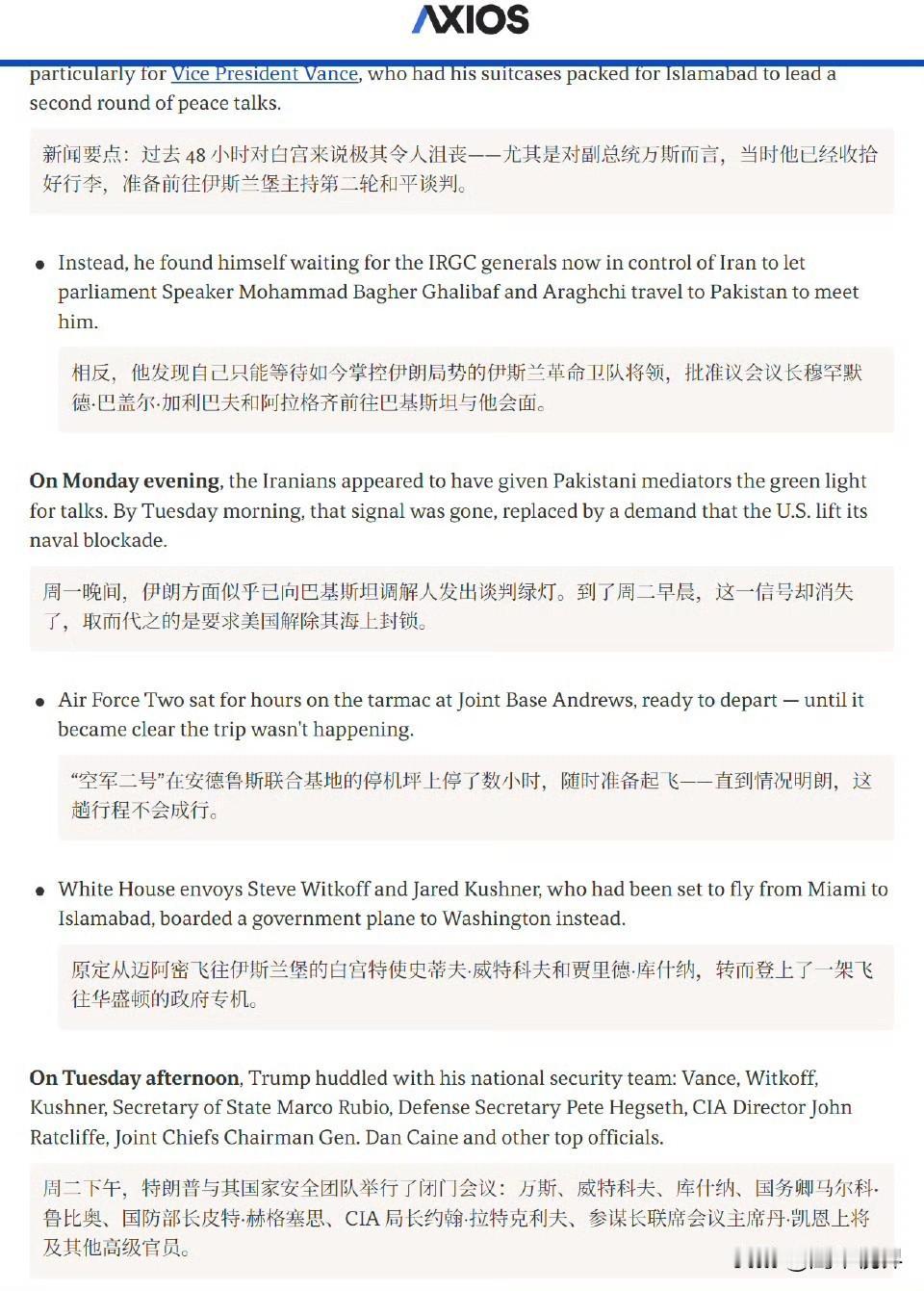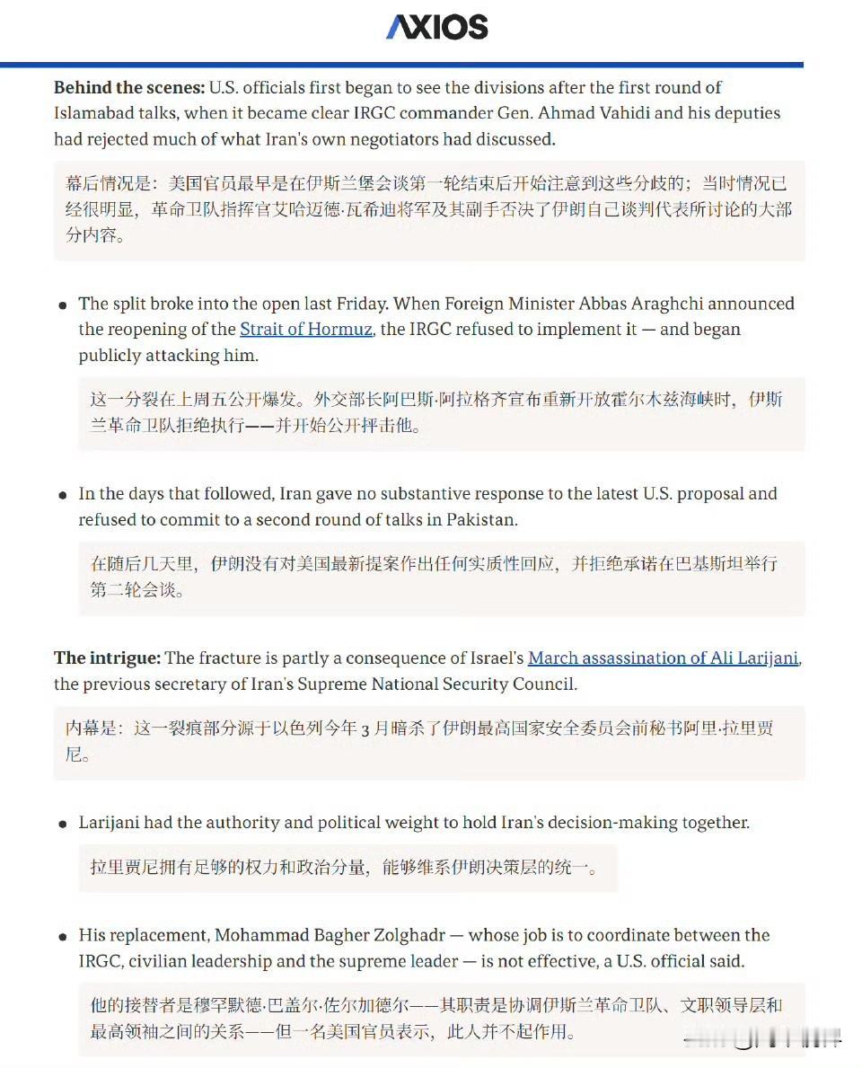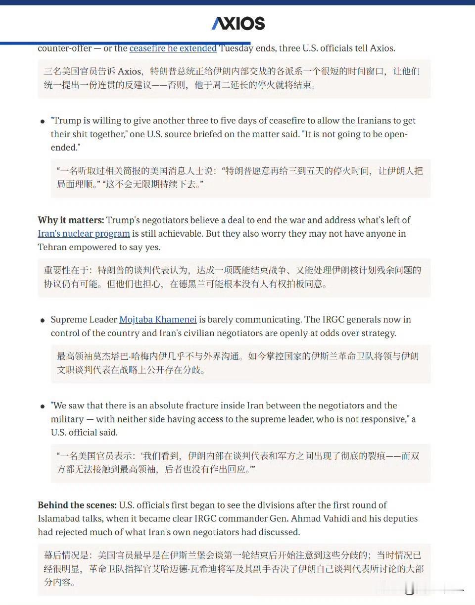 你看 Axios 的这个巴拉克·拉维德说的什么:“特朗普给伊朗几天时间结束权力斗争,重返和平谈判。三名美国官员告诉 Axios,特朗普总统正给伊朗内部交战的各派系一个很短的时间窗口,让他们统一提出一份连贯的反建议——否则,他于周二延长的停火就将结束。一名听取过相关简报的美国消息人士说:‘特朗普愿意再给三到五天的停火时间,让伊朗人把局面理顺。这不会无限期持续下去’。”“最高领袖莫杰塔巴·哈梅内伊几乎不与外界沟通。如今掌控国家的伊斯兰革命卫队将领与伊朗文职谈判代表在战略上公开存在分歧。一名美国官员表示:‘我们看到,伊朗内部在谈判代表和军方之间出现了彻底的裂痕——而双方都无法接触到最高领袖,后者也没有作出回应’。美国官员最早是在伊斯兰堡会谈第一轮结束后开始注意到这些分歧的;当时情况已经很明显,革命卫队指挥官艾哈迈德·瓦希迪将军及其副手否决了伊朗自己谈判代表所讨论的大部分内容。”不知道的还以为巴拉克·拉维德趴在德黑兰某个床底下呢。把伊朗各种贬低一番,最后还是要承认:“过去 48 小时对白宫来说极其令人沮丧——尤其是对副总统万斯而言,当时他已经收拾好行李,准备前往伊斯兰堡主持第二轮和平谈判。他发现自己只能等待如今掌控伊朗局势的革命卫队将领,批准议会议长穆罕默德·巴盖尔·加利巴夫和阿拉格齐前往巴基斯坦与他会面。”所以,什么“伊朗内部不和”、“伊朗消息矛盾”基本都是 Axios 编出来的。但是,你如果把报道中的“伊朗”换成“美国”,“德黑兰”换成“华盛顿”,人名换成特朗普团伙,突然就说的通了。