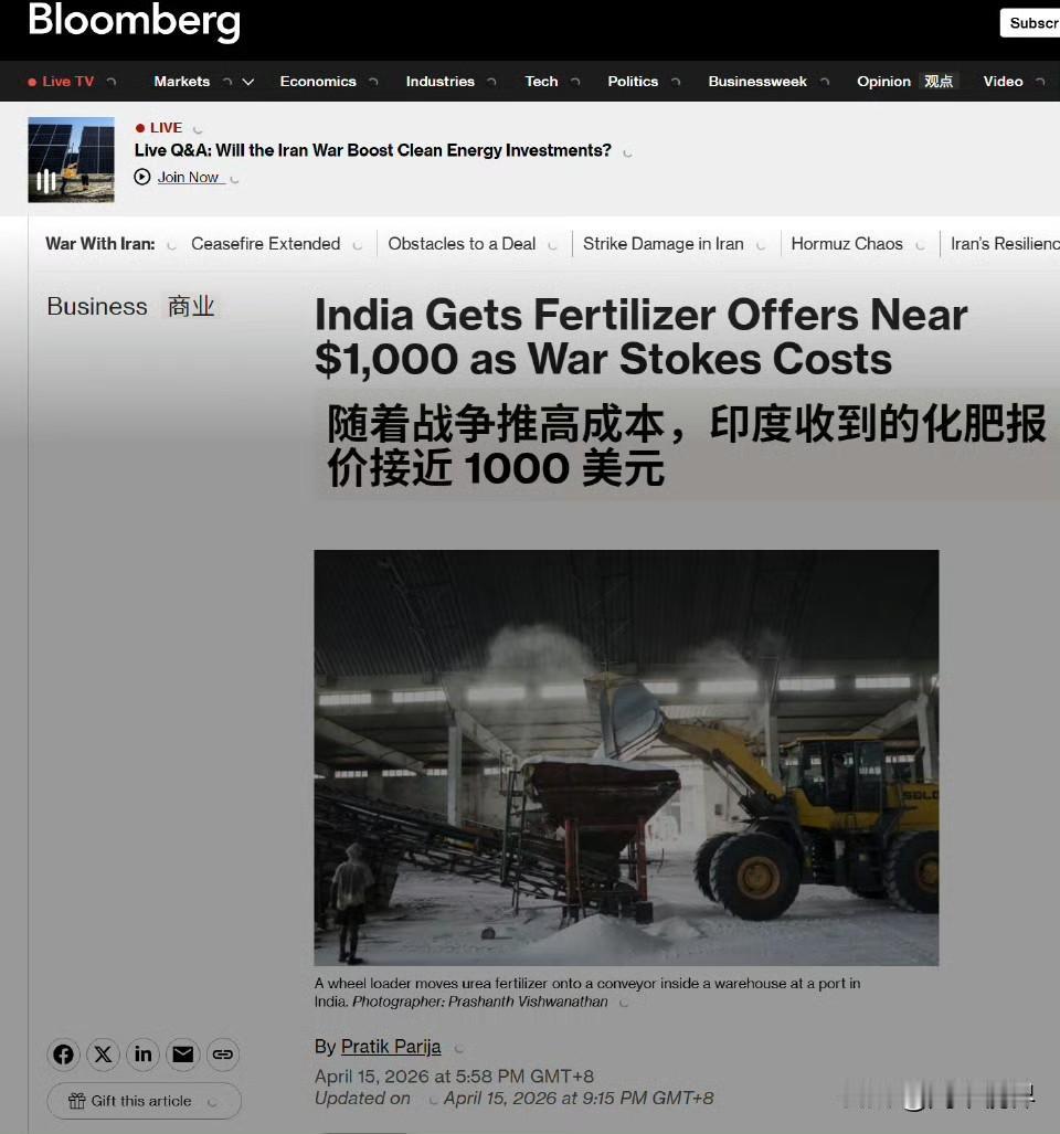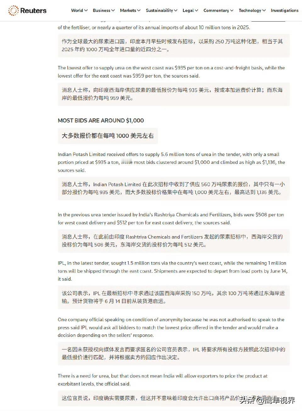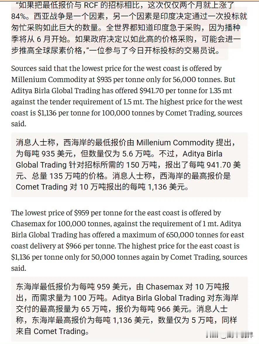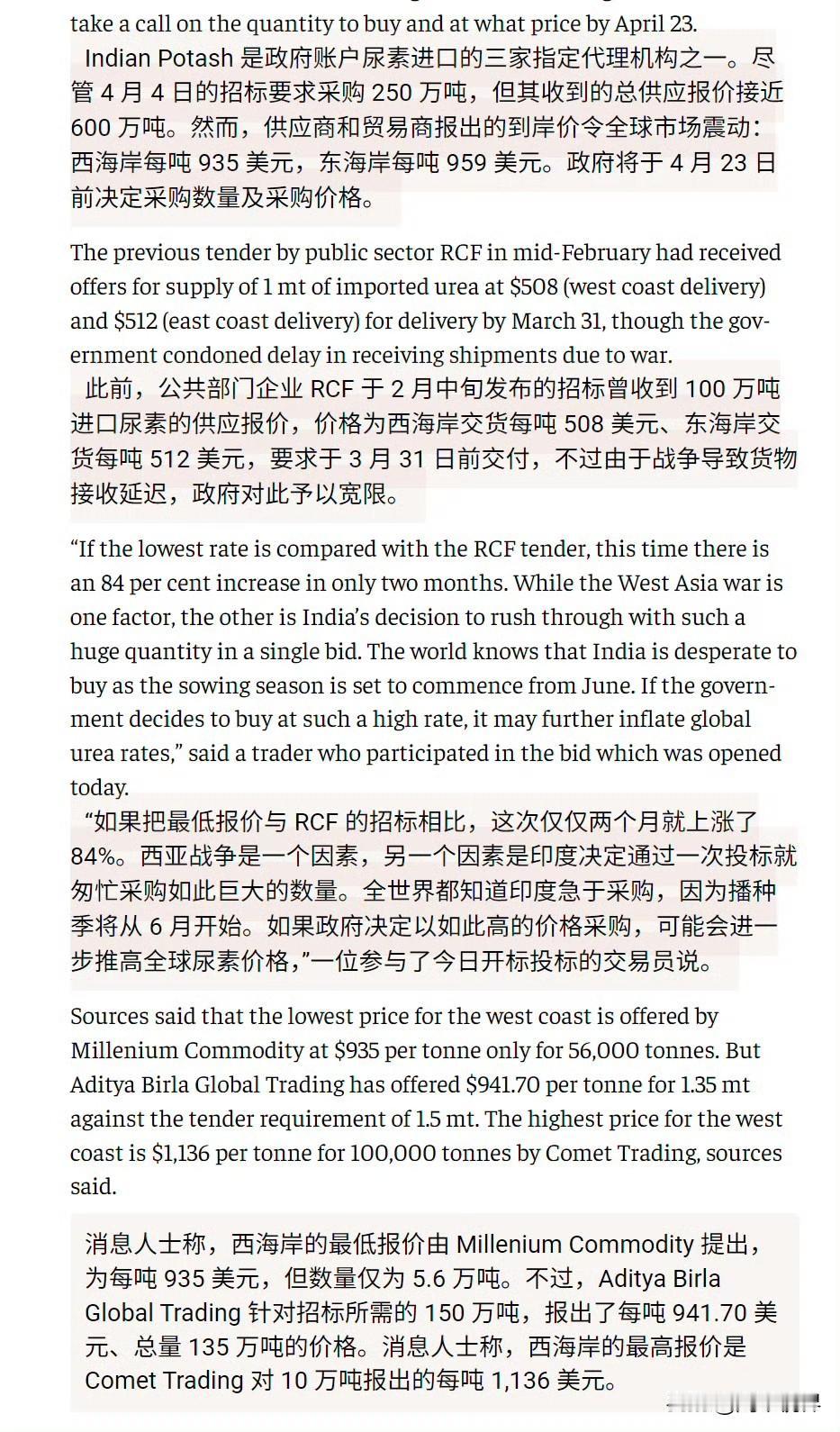 路透社、彭博社、thehindubusinessline 报道:印度将以伊朗冲突前的近两倍价格购买化肥。随着伊朗战争推高成本,印度收到接近 1000 美元的化肥报价,为印度政府进口农作物肥料的印度钾肥有限公司同意以每吨935美元的价格购买150万吨肥料,在西海岸地区交付;另外100万吨将在东海岸交付,单价为每吨959美元。这些报价比印度在冲突爆发前在招标中所同意支付的价格高出近90%。消息人士称,伊朗战争爆发以前,由印度 Rashtriya Chemicals and Fertilizers 发起的尿素招标中,西海岸交货的投标价为每吨 508 美元,东海岸交货的投标价为每吨 512 美元。