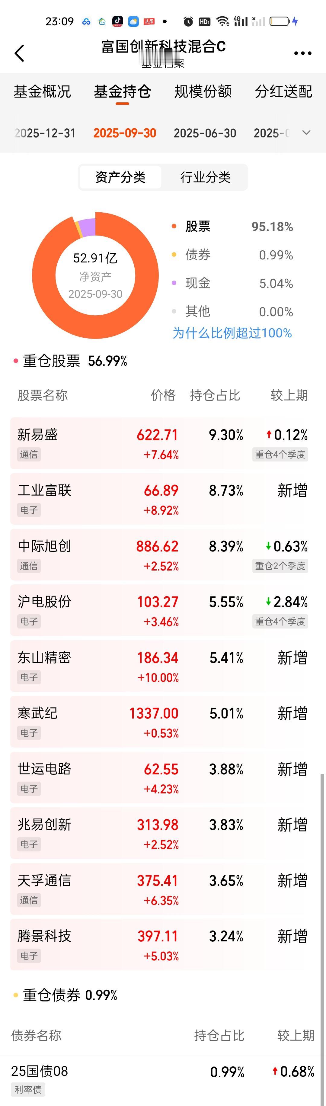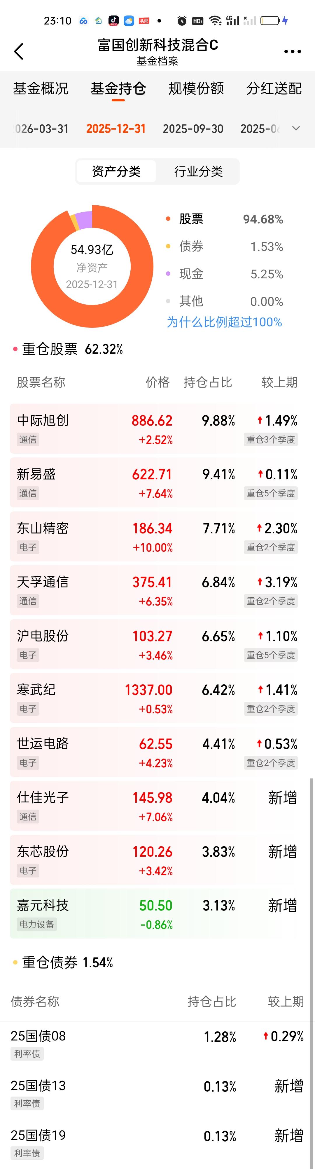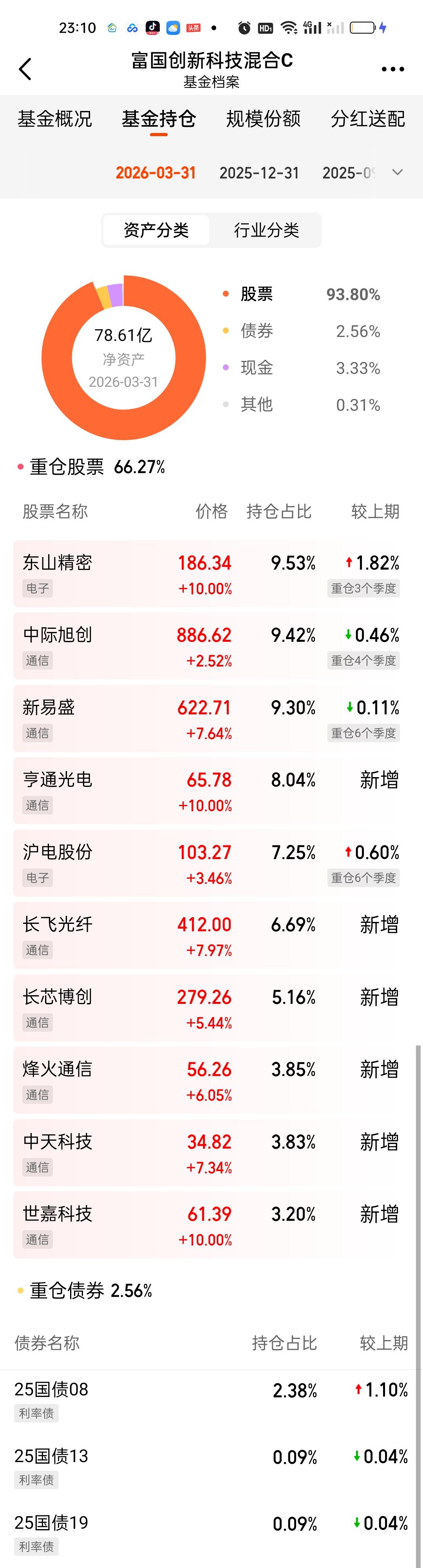 富国科技创新这次调整新增了6只个股,亨通光电,长飞光纤,长芯博创,烽火通信,中天科技,世嘉科技,舍弃了天孚通信,寒武纪,世运电路,仕佳光子,东芯股份,嘉元科技。基金规模从54.93亿增加到了78.61亿,前十大重仓股占比从62.32%提升到了66.27%。