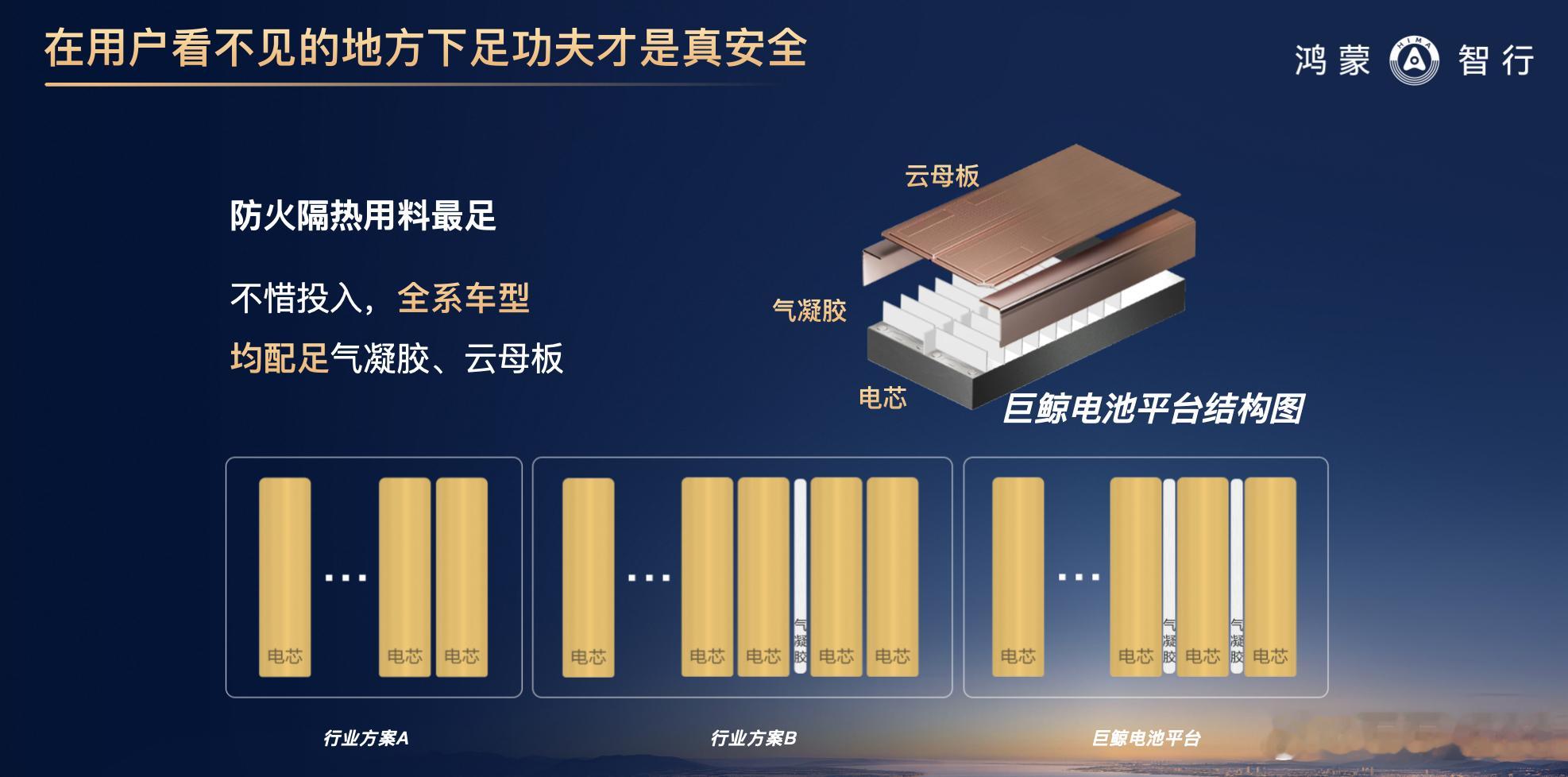 很多厂商为了节省成本,会选择隔一颗电芯用一层气凝胶。华为从 2021 年的问界M5开始,就用足了气凝胶和云母板,确保每两个电芯中间都夹一个气凝胶,每一颗电芯上都覆盖着云母板。网上很少有拆解巨鲸电池的内容,其实但凡拆开对标,都会感叹巨鲸电池的用料扎实,而且从十几万的尚界H5,到上百万的尊界S800都是同样的水平。