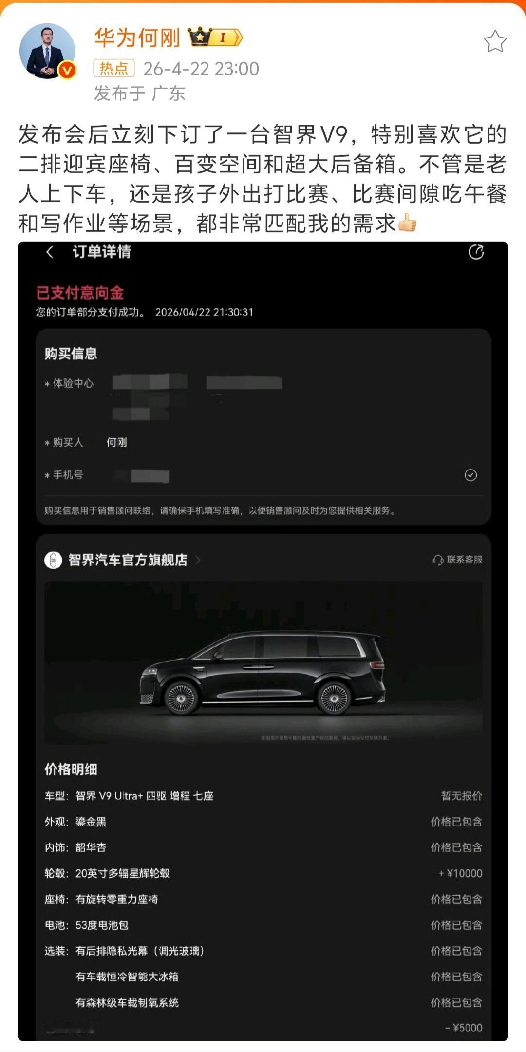 难怪连华为终端CEO何刚都带头下订,难怪智界V9预售仅一个小时,订单便突破12500台,原来这么有料啊!