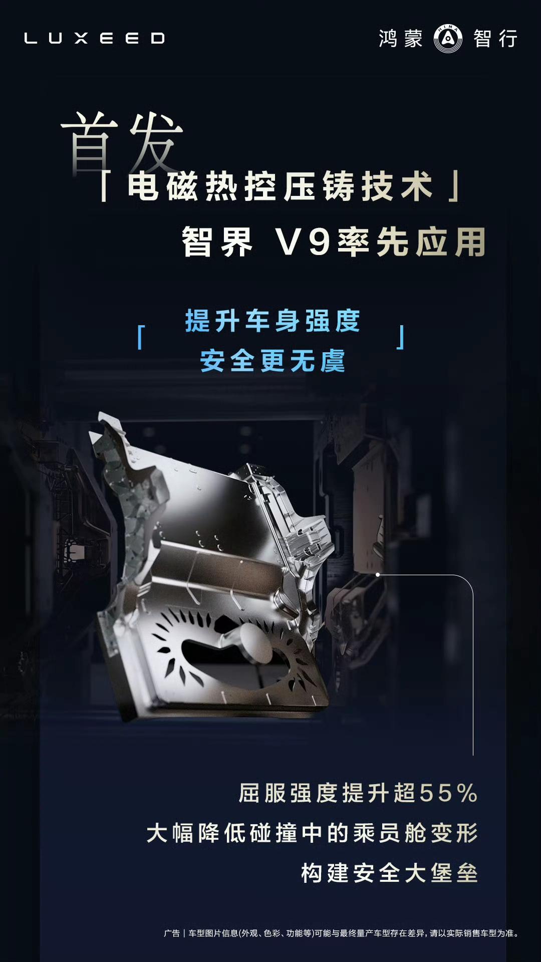 余承东在鸿蒙智行新品发布会上表示,传统的几千吨铝合金一体化压铸技术已经落后了,属于过去时代的技术。他说,鸿蒙智行已经开始采用了行业首创的电磁热控压铸车身技术,其精密程度相当于从堆积木进化到了3D打印,能让车身强度更强,重新定义了汽车安全。智界V9这款MPV将首发华为的这项电磁热控压铸车身技术,重新定义MPV,堪称“MPV中的MVP”。