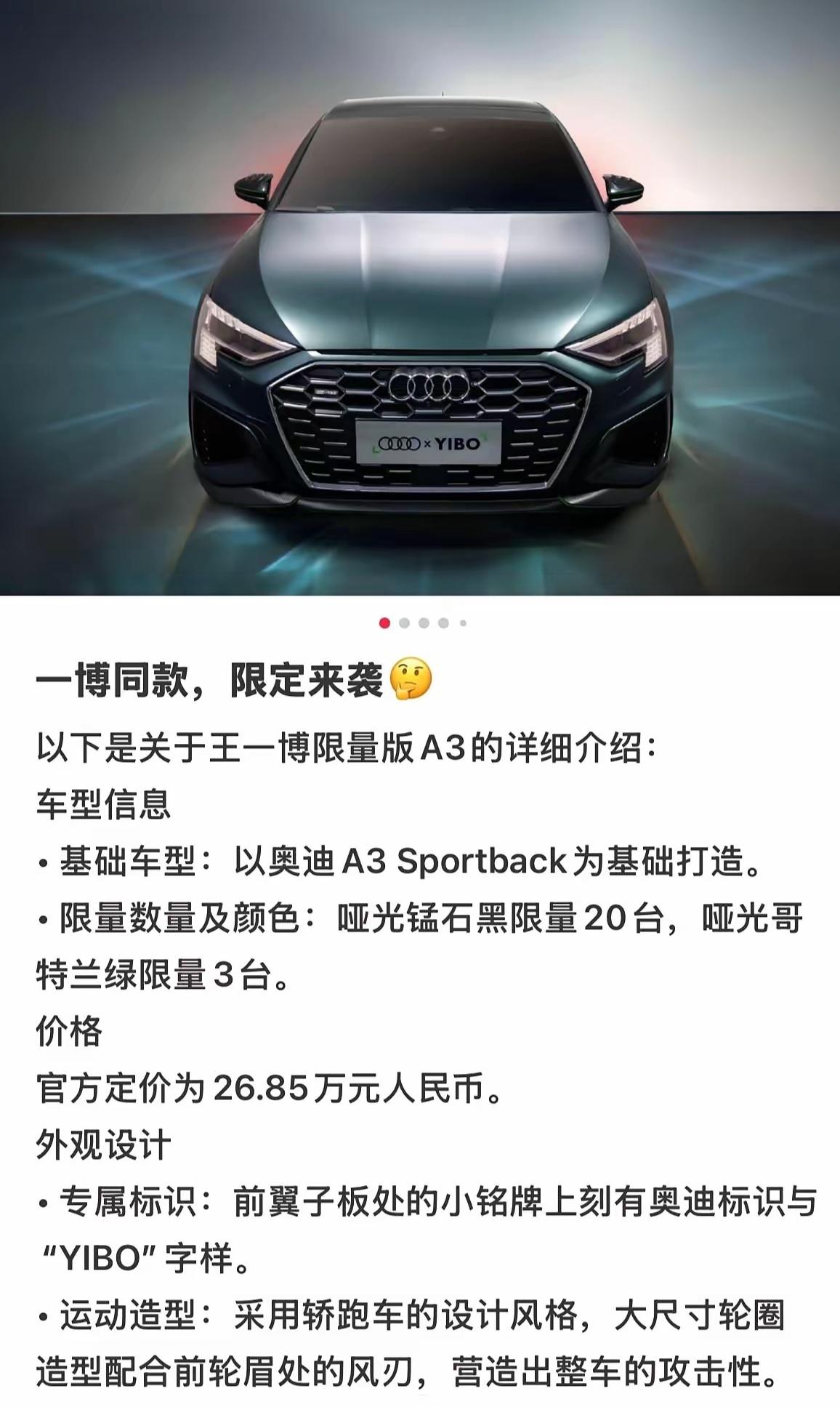 可是呢,人家王一博的车代是奥迪,还是携手合作七年的奥迪,奥迪还说了“我们会一直在一起”,并且还曾特意出了代言人王一博联名销量款,量身打造!