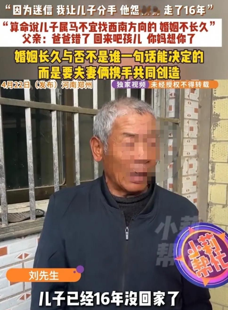 父亲三次拆散儿子恋情!河南郑州,小刘谈过三段恋爱,父亲就干预了三次。第一个,父亲嫌女方家太远,不同意。第二个,他看不上,一直从中阻挠。第三个,两人已经准备谈婚论嫁,父母特意去算了算,说女方方位不合,又逼着小刘分了手。三次感情,全都没能走到最后。小刘在家看不到希望,最后选择离家出走。这一走,就是十六年。这期间,他没有和父母通过一次电话,刻意断了所有联系。直到最近,父亲才觉得后悔,四处托人打听,终于得知儿子曾在上海居住。可他匆匆赶过去,房东却告诉他:儿子早就搬走了,临走前还特意交代——不要让家里人找他,他不会原谅。