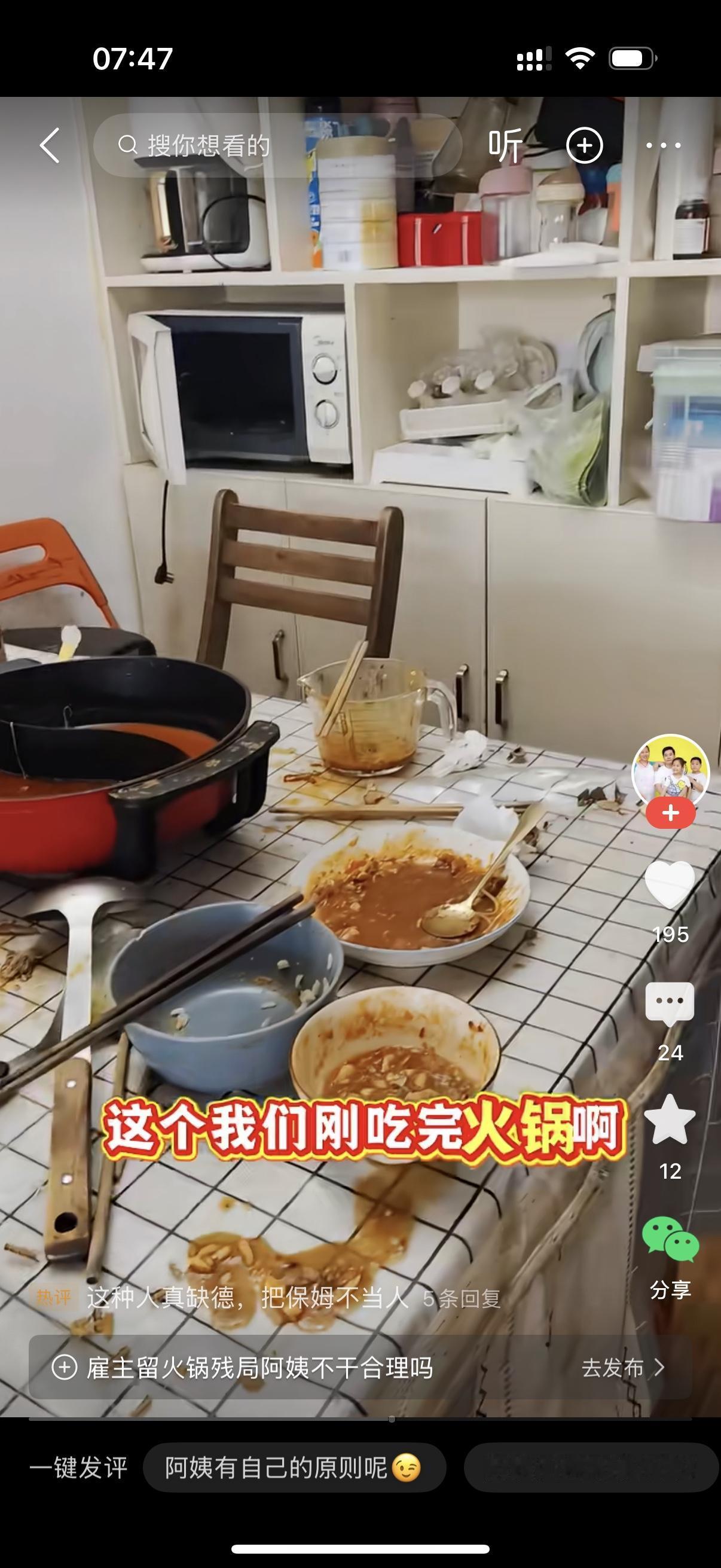 保姆休假回来刚进门就看到餐桌上一片狼藉。保姆问雇主怎么回事啊?雇主说,我们刚吃完的火锅,等你回来收拾了。你赶紧收拾一下。保姆连连摇头,不好意思,这活我干不了,你们自己收拾。雇主直接发飙,我请你来是干活的,不是让你来享福的。保姆硬怼,我享福也不在你家享,你这个周扒皮,你给我结工资,我下户行吧?雇主气的直接发抖。这个保姆去哪都没人要,雇主给你钱,这活你不干谁干?