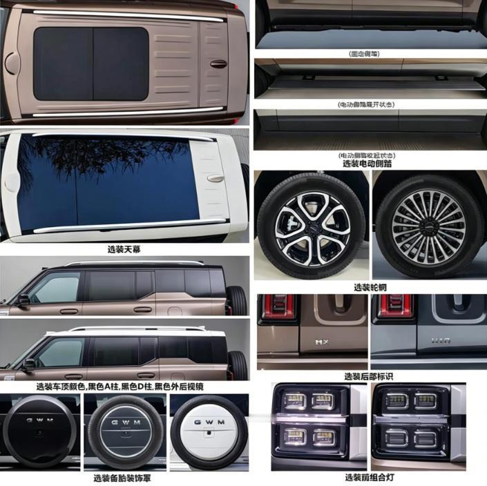 外观这块,长城H10走的是纯硬派方盒子路线,跟那些圆润的城市SUV完全不是一个路子。车头横平竖直,方形矩阵大灯配半封闭格栅,看着就不好惹。车顶上顶着激光雷达,旁边还带着行李架,智驾和户外两不误。侧面平直车顶线、宽体轮眉、机械门把手、侧踏板,全是实用的东西,没有花里胡哨的设计。车尾外挂备胎、侧开尾门、方形尾灯,硬派SUV该有的元素一个没落。