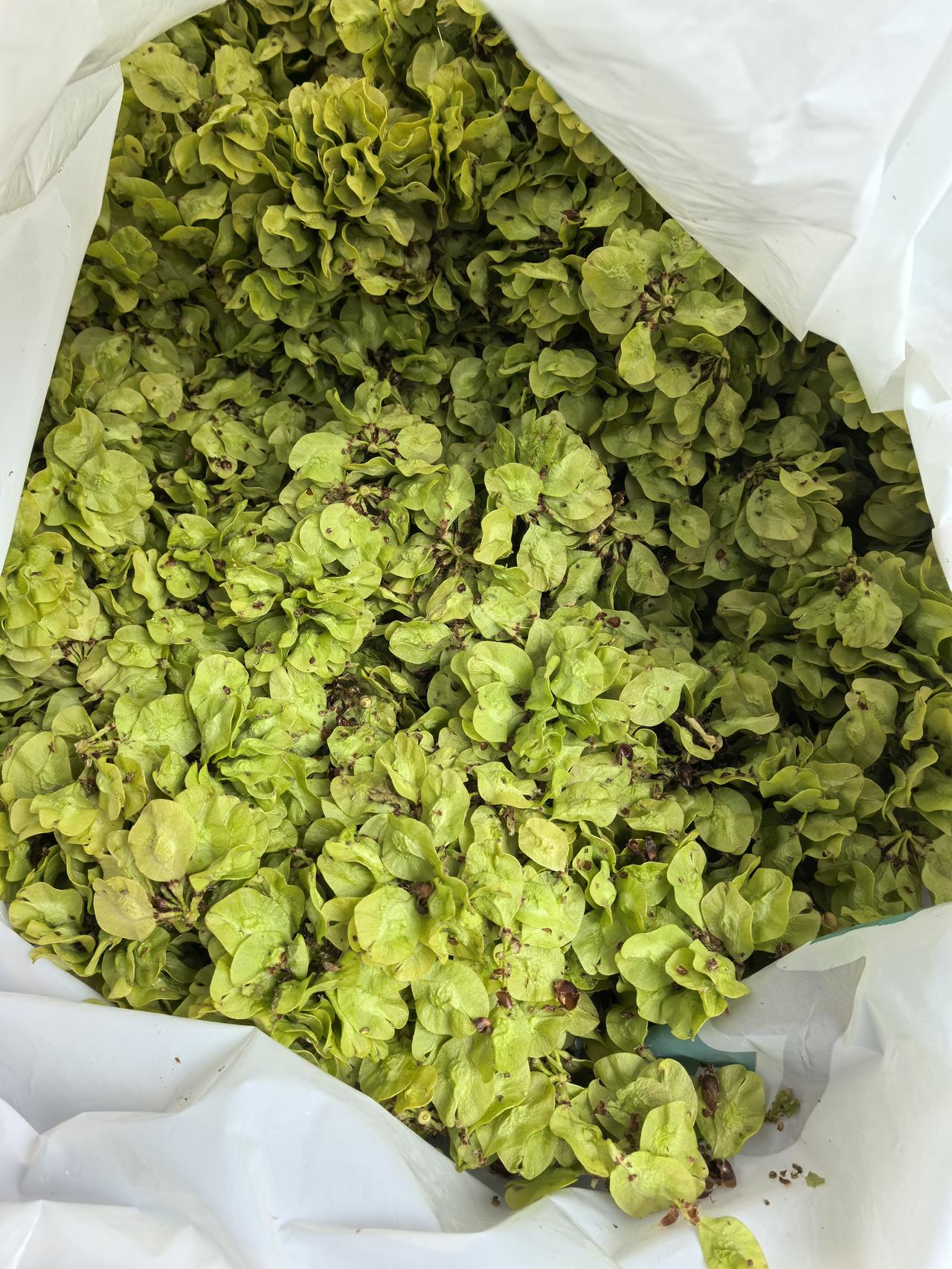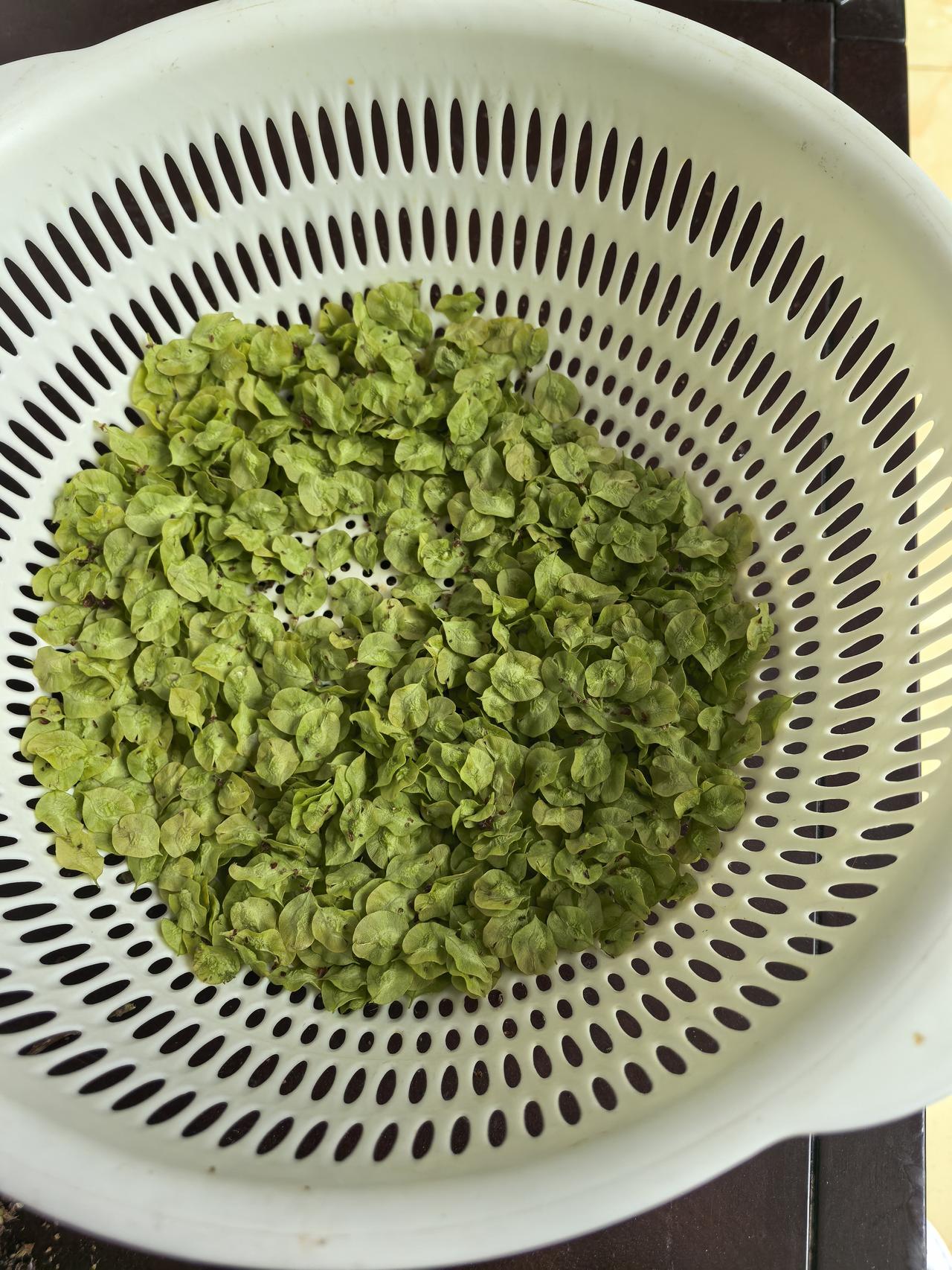 首先得重新拣一遍,这可是个费时耗人的活。拣榆钱不能着急,不能一把把的去抓,得一小撮一小撮把榆钱的后径揪掉,把周边缠绕的毛絮絮清理干净,只保留榆钱的片。你想想这个活有多耗人吧!这道工序完成后,基本是实物一半,杂质也有一半儿,即便是如此,也弄不干净。榆钱里边儿仍然混着一些类似榆钱壳的东西,还有一些虫卵,和一些草叶子。