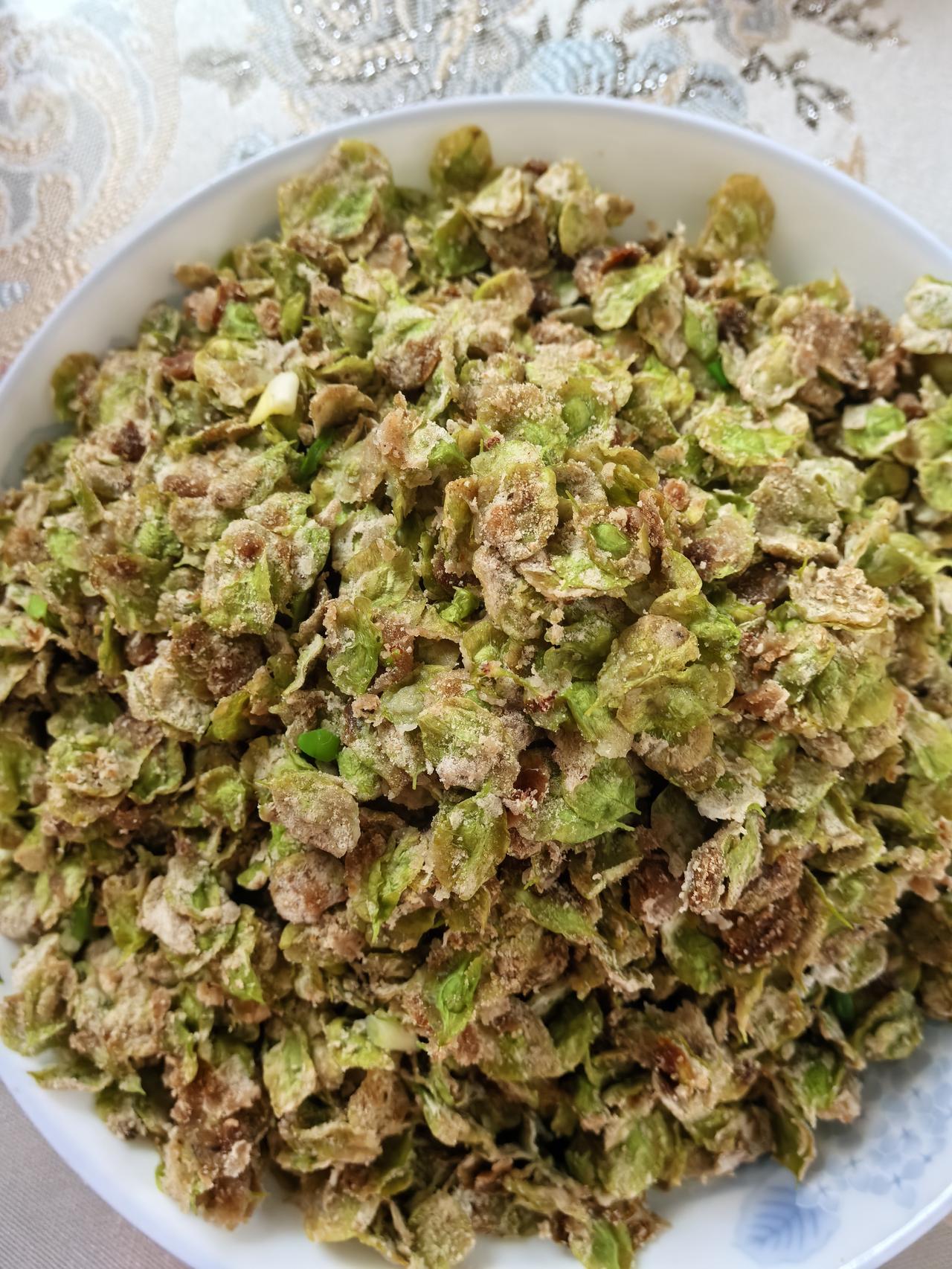 第三道工序就是拌面调味上笼蒸,这也是个技术活。面多了榆钱糊的厚,尝不出榆钱的味,面少了,榆钱容易蔫吧,吃起来像坏了似的。调味时除了盐糖味精,可少许加点熟油和香油,一定要拌均匀,再上锅去蒸。蒸的时候必须是开水,时间也不能长,五六分钟就够了,停火就要开盖,这样能防止榆钱颜色发黄,口感也比较鲜嫩。