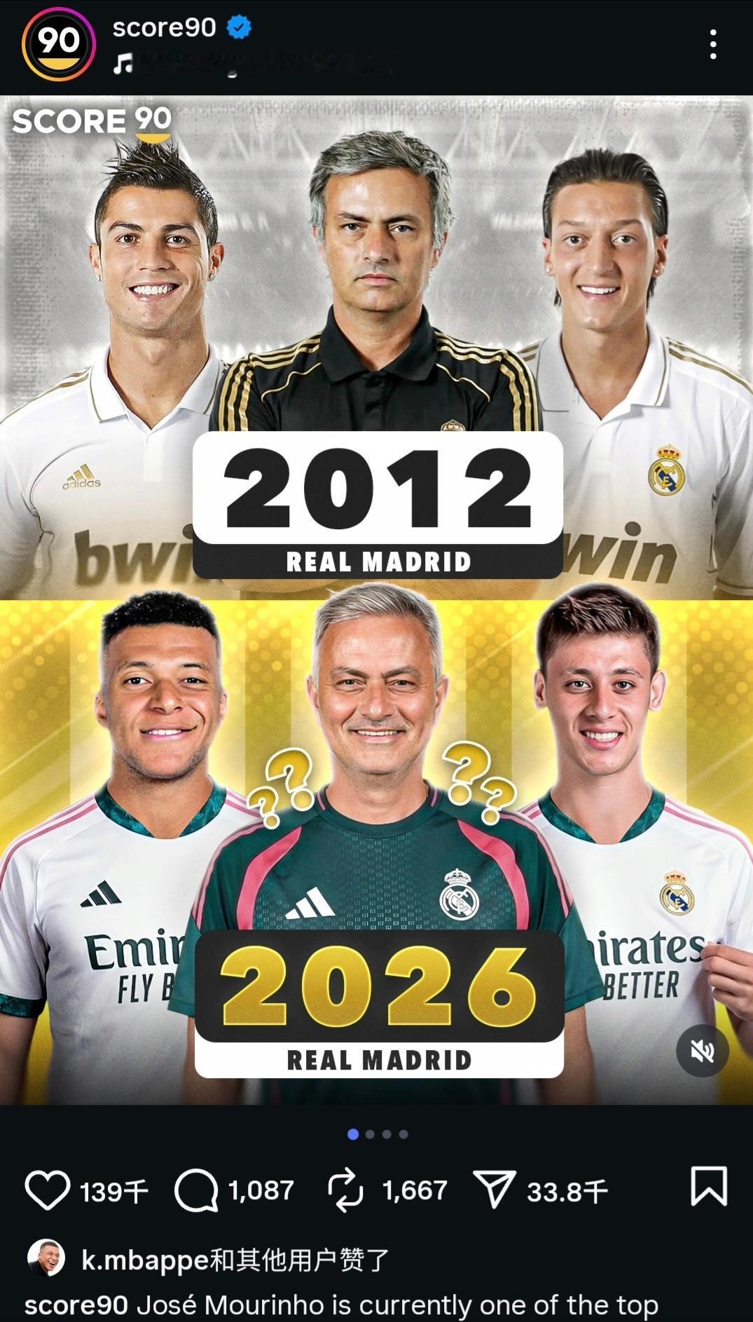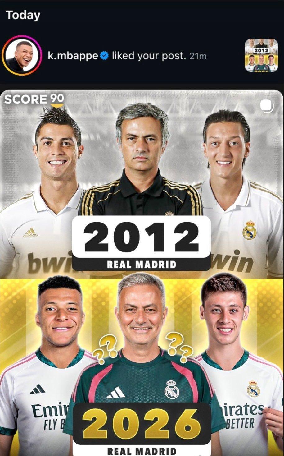 我晕,姆巴佩还真的点赞“穆里尼奥时隔14年将要重新执教皇马”的推文。很明显,皇马