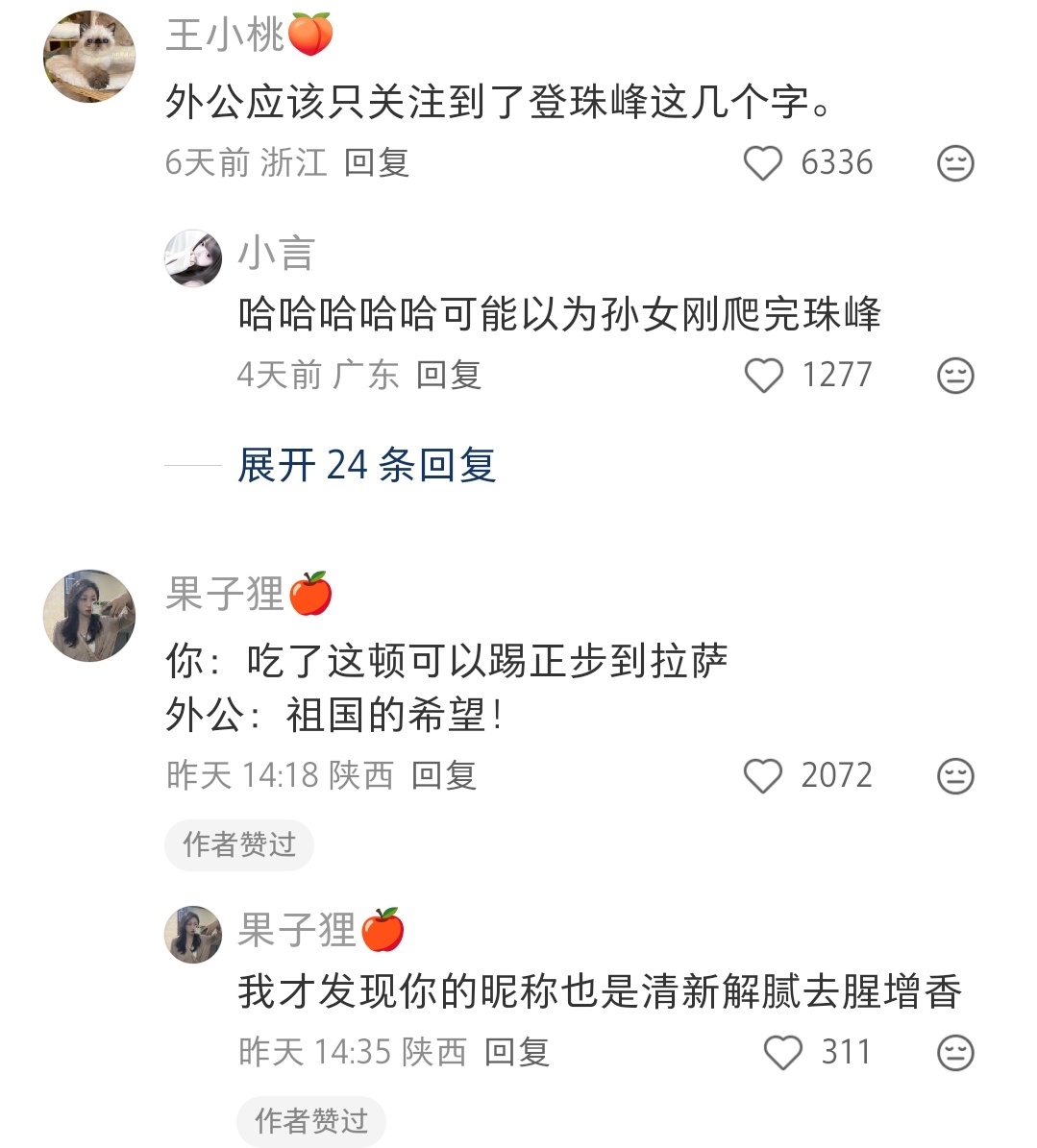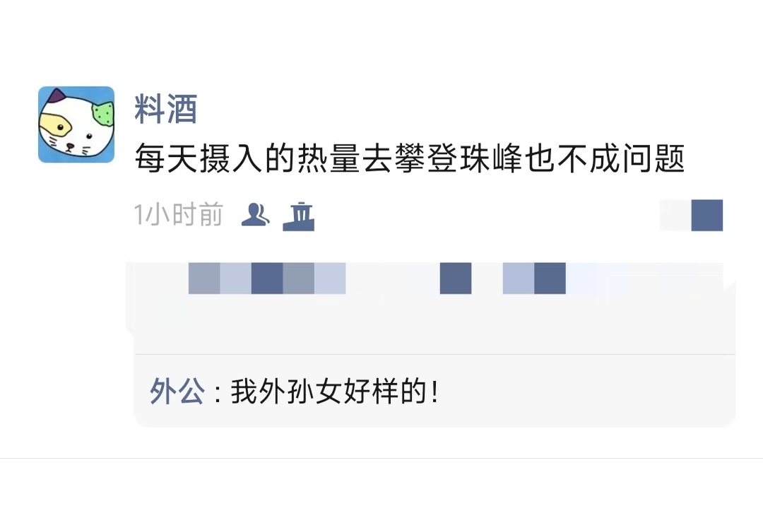 哈哈哈每天摄入的热量去攀登珠峰也不成问题。外公:我孙女厉害啊,能攀登珠峰
