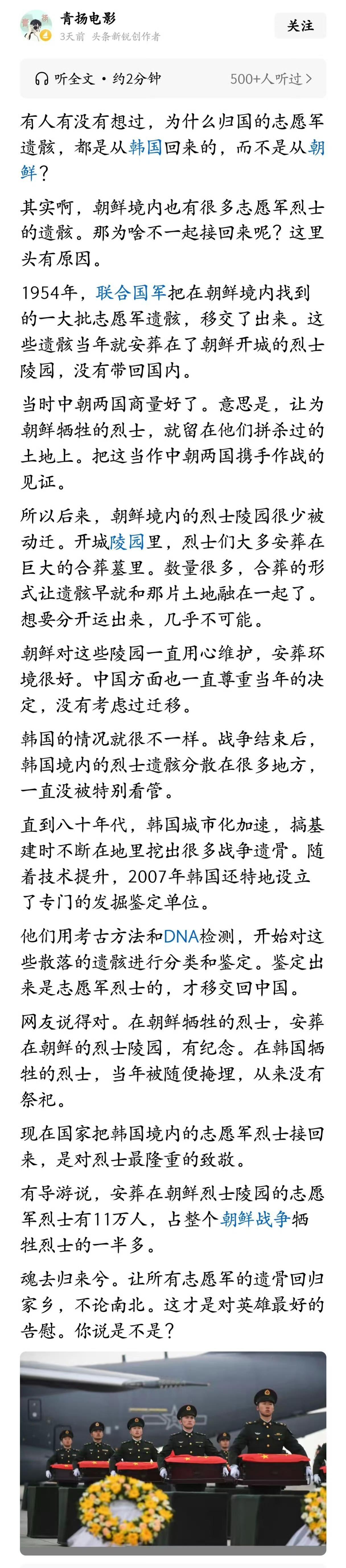为什么归国的志愿军遗骸,都是从韩国回来的,而不是从朝鲜?
