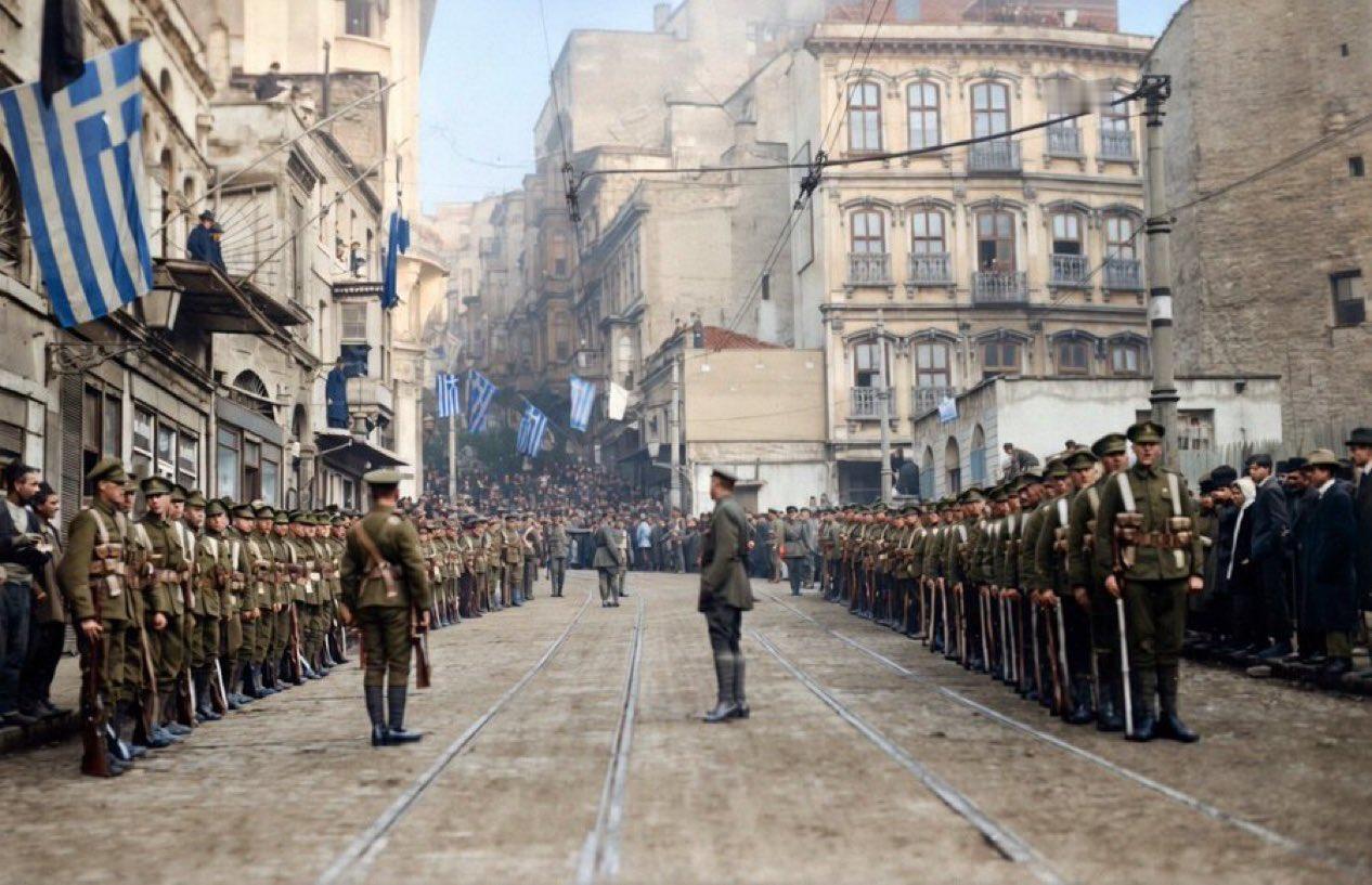 一张 1919 年的彩色修复照片,照片中英国军队在一战后盟军占领君士坦丁堡期间,在一条街道上列队,街道两旁是电车轨道、建筑物和醒目的希腊国旗。