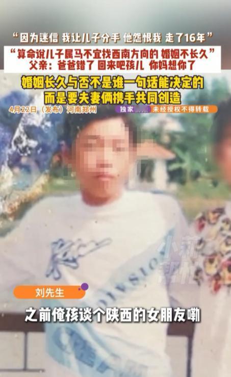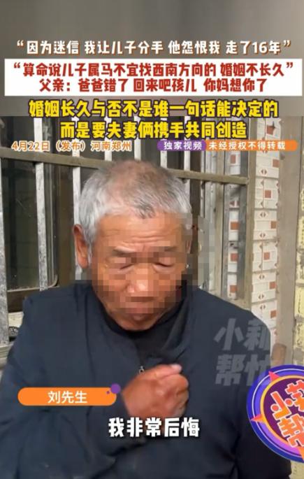 父亲三次拆散儿子恋情!河南郑州,小刘谈过三段恋爱,父亲就干预了三次。第一个,父亲嫌女方家太远,不同意。第二个,他看不上,一直从中阻挠。第三个,两人已经准备谈婚论嫁,父母特意去算了算,说女方方位不合,又逼着小刘分了手。三次感情,全都没能走到最后。小刘在家看不到希望,最后选择离家出走。这一走,就是十六年。这期间,他没有和父母通过一次电话,刻意断了所有联系。直到最近,父亲才觉得后悔,四处托人打听,终于得知儿子曾在上海居住。可他匆匆赶过去,房东却告诉他:儿子早就搬走了,临走前还特意交代——不要让家里人找他,他不会原谅。