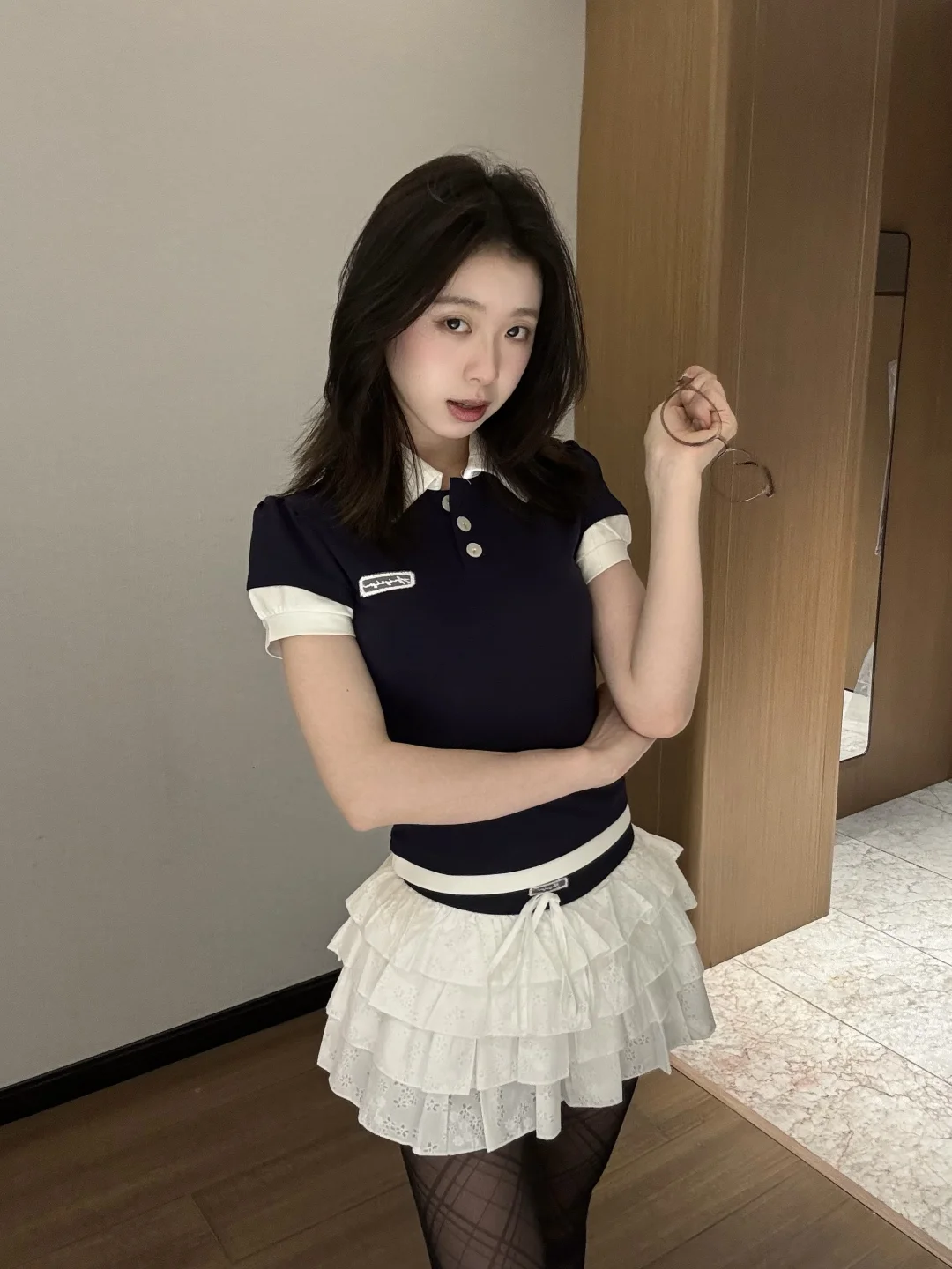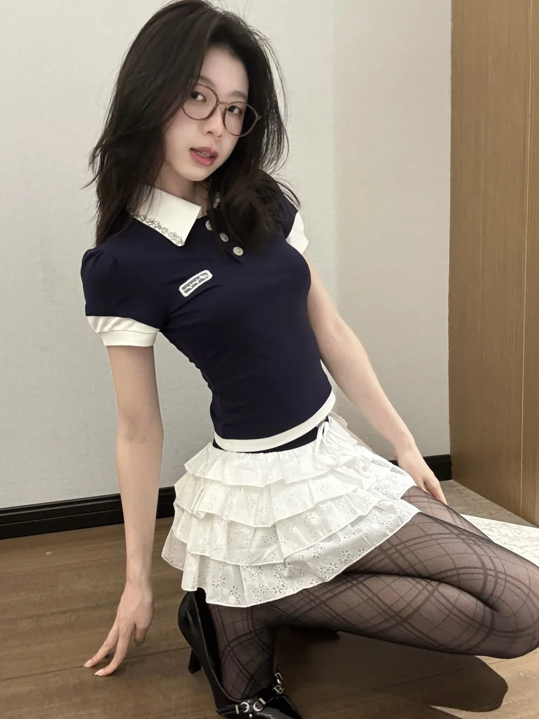 藏蓝polo衫撞色白翻领,自带复古少女感🍓