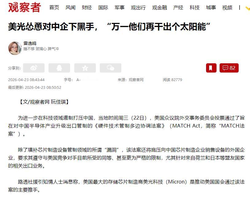名字挺绕,叫《硬件技术管制多边协调法案》,简称MATCH法案,说白了就是美国想彻底卡住中国芯片的发展,不光自己卡,还逼着荷兰、日本这些盟友一起卡,背后最卖力撺掇的,就是美国最大的存储芯片公司——美光科技。