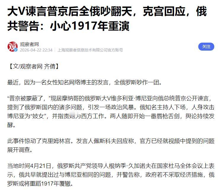据媒体4月22日报道:一个住在摩纳哥的俄罗斯女网红,名叫维多利亚·博尼亚,直接对着普京总统喊话,说“普京被蒙蔽了”,还说了一堆俄罗斯国内的问题。