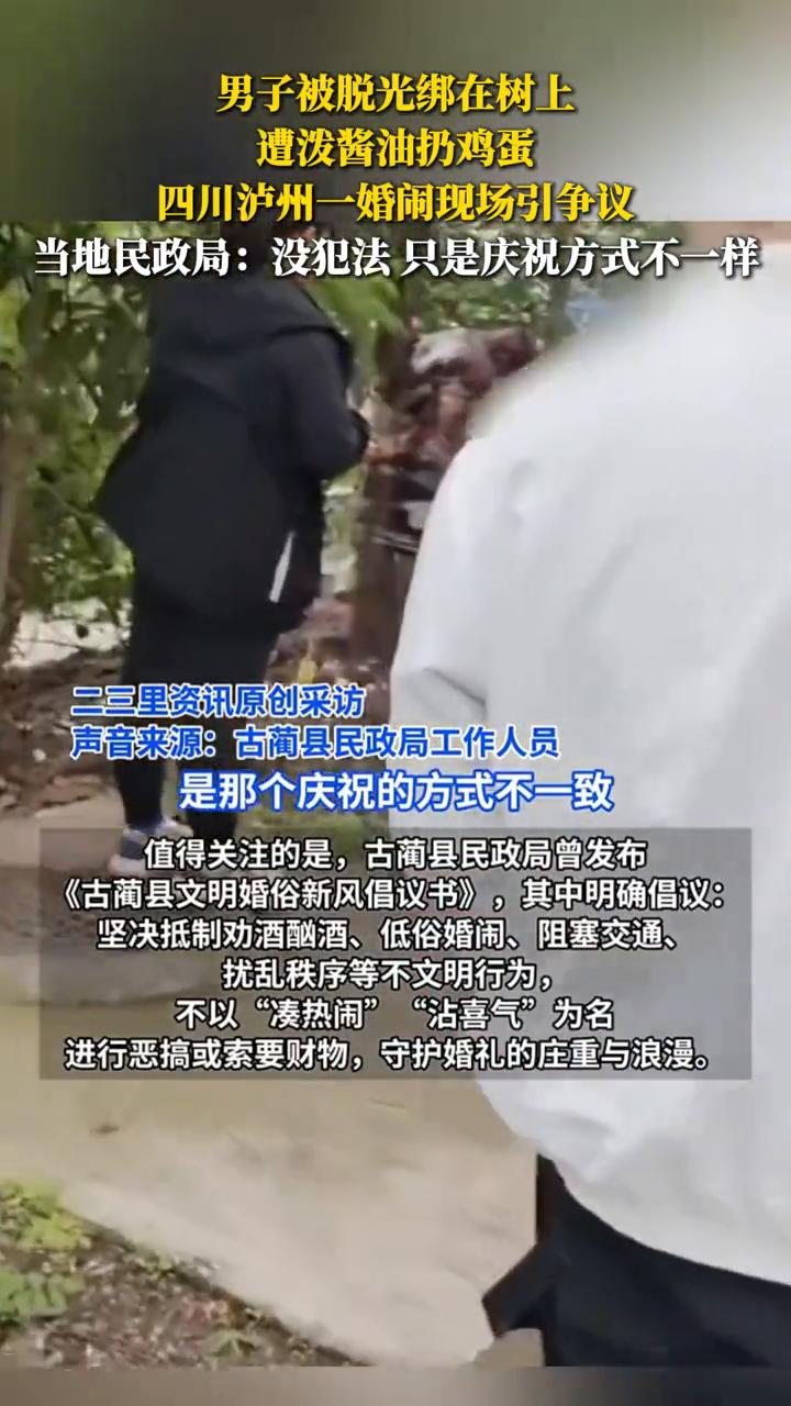 4月22日,四川泸州。有网友发布一段视频称"活几十岁了,第一次见古蔺人结婚有这种闹婚的,太恐怖了"。视频配文:古蔺蔺郎国际门口,今天结婚的新郎穿着短裤绑在树上多名婚闹泼酱油砸生鸡蛋。