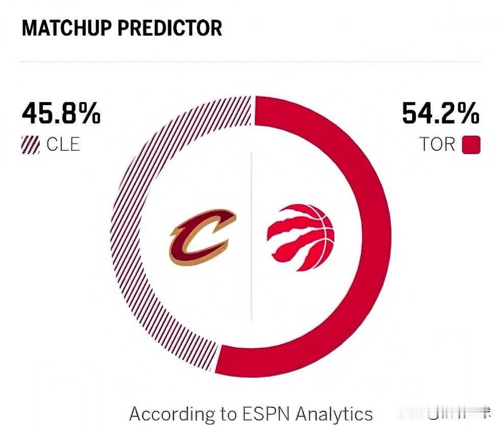 明天东部首轮G3,骑士客场挑战猛龙,目前骑士大比分2-0领先。赛前,ESPN预测本场比赛两队的胜率:骑士45.8%,猛龙54.2%。