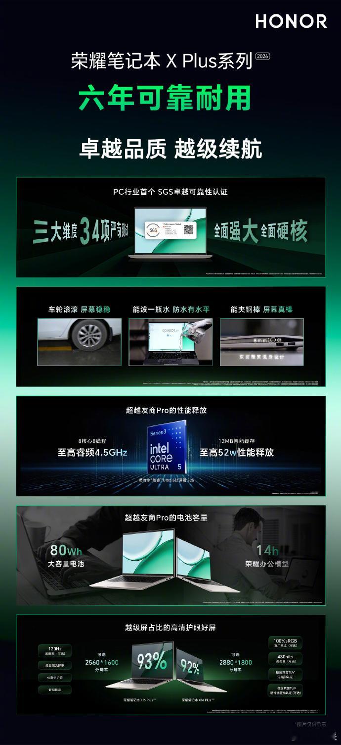 荣耀笔记本 X PLus系列首销国补价5099-5694元亮点配置:机身够硬还防水;搭载酷睿Ultra5处理器,最高52W性能释放;80Wh大电池;