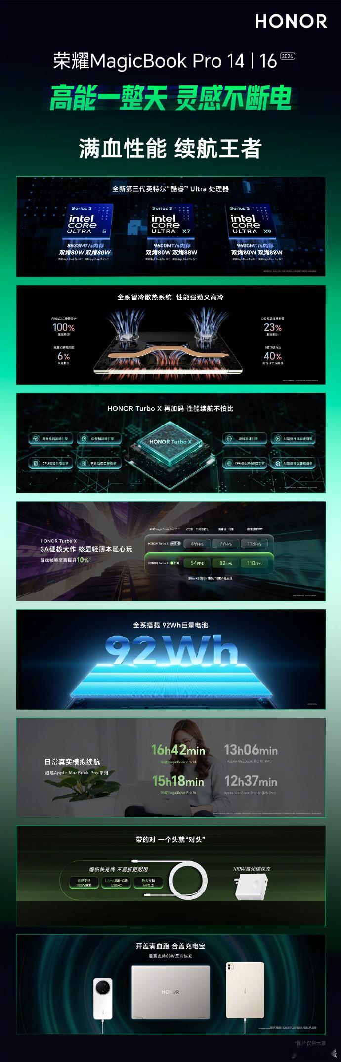 荣耀MagicBook Pro系列首销国补价6799-9499元亮点配置:全系搭载第三代酷睿Ultra处理器,而且有Turbo X调校;全系92Wh电池,续航至高16.7小时,还有100W快充和80W反向快充;全系雷电4接口16寸版本屏幕升级到3K分辨率165Hz,6扬声器;